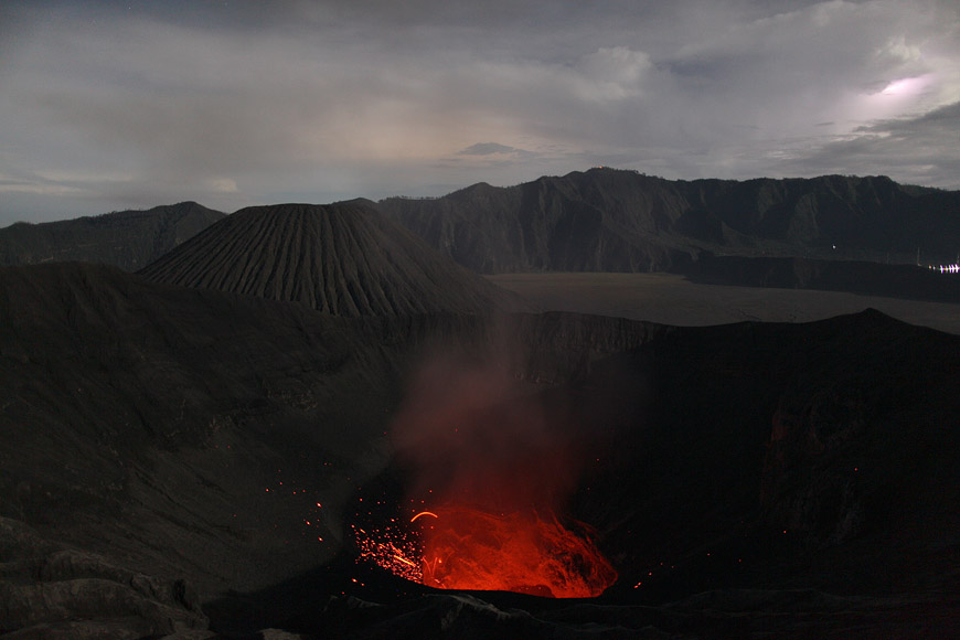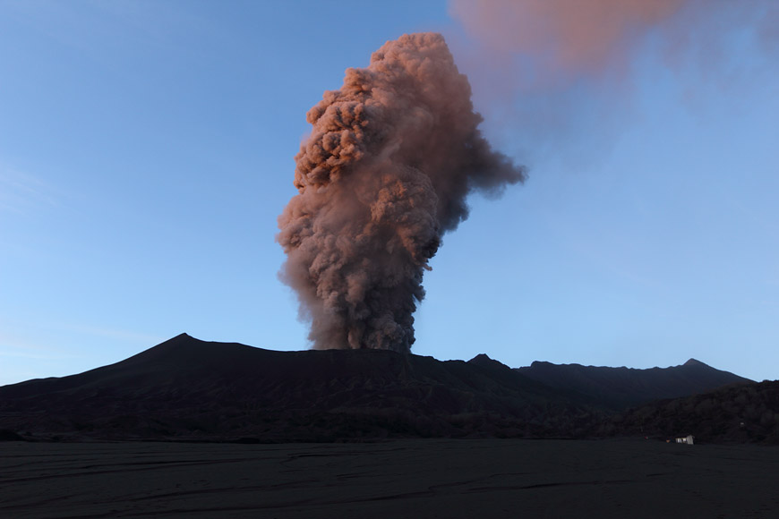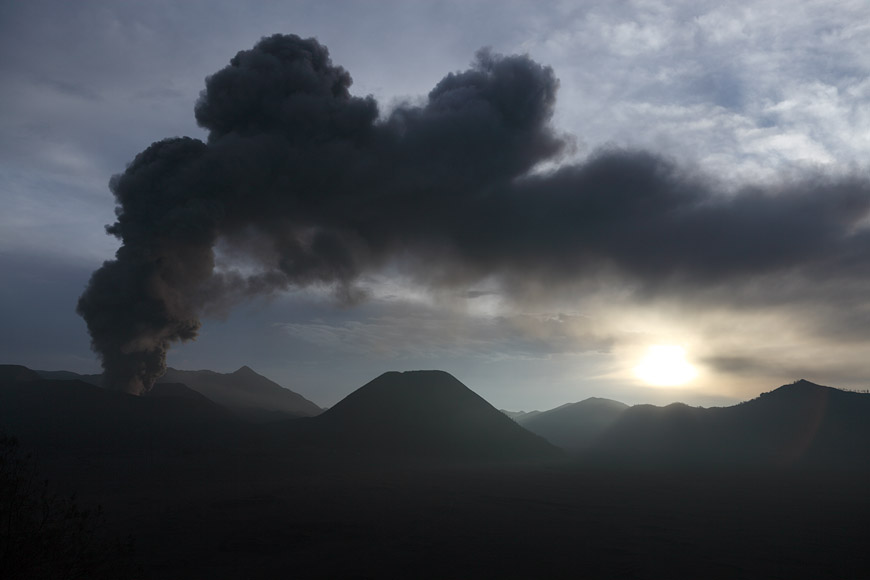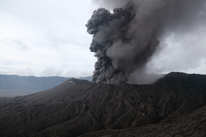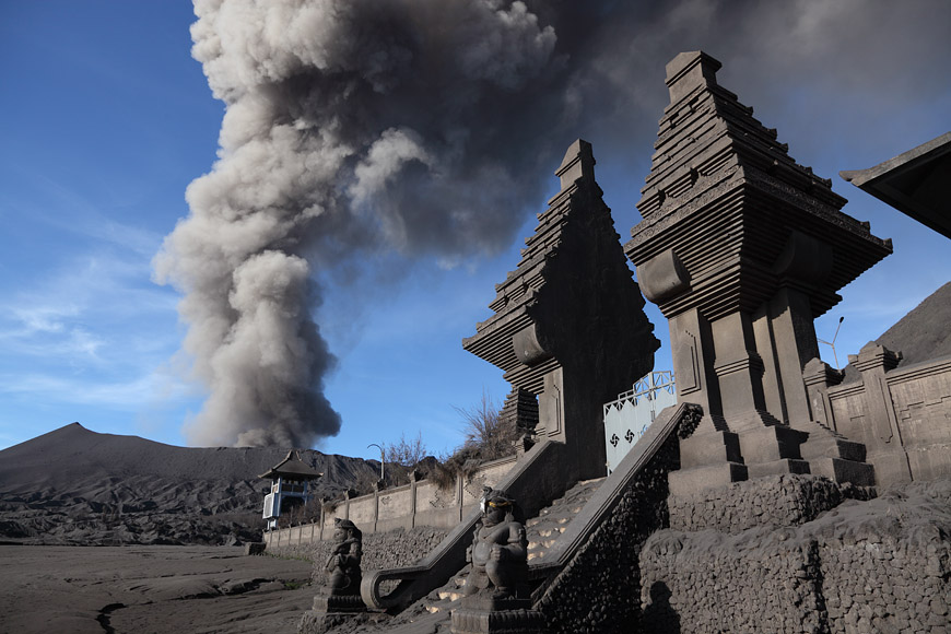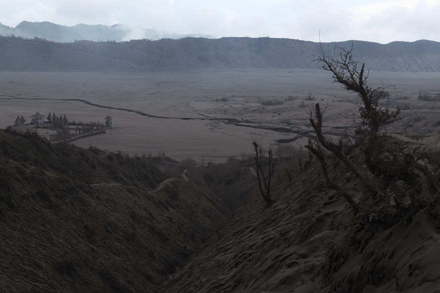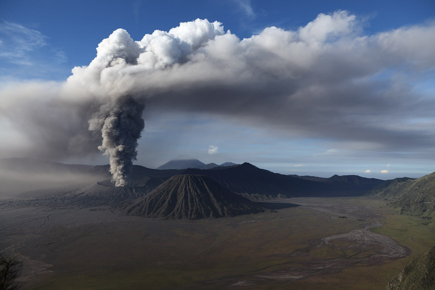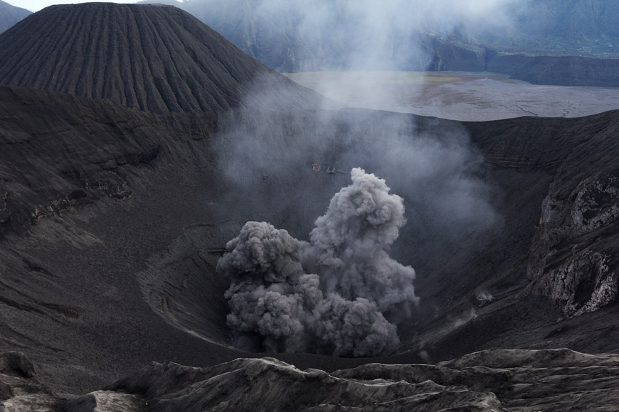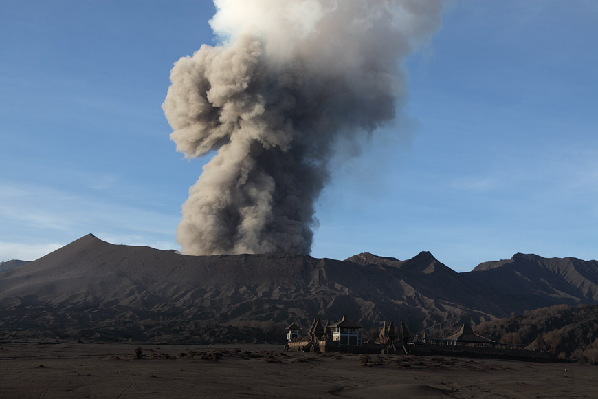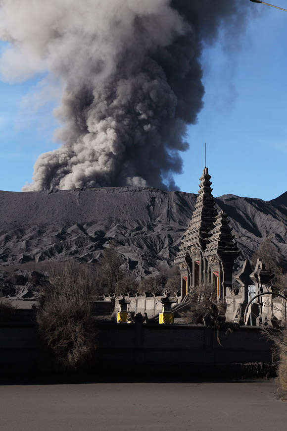Bromo Temple below Mt. Batok (lower middle) gives scale