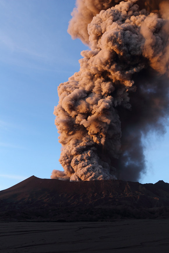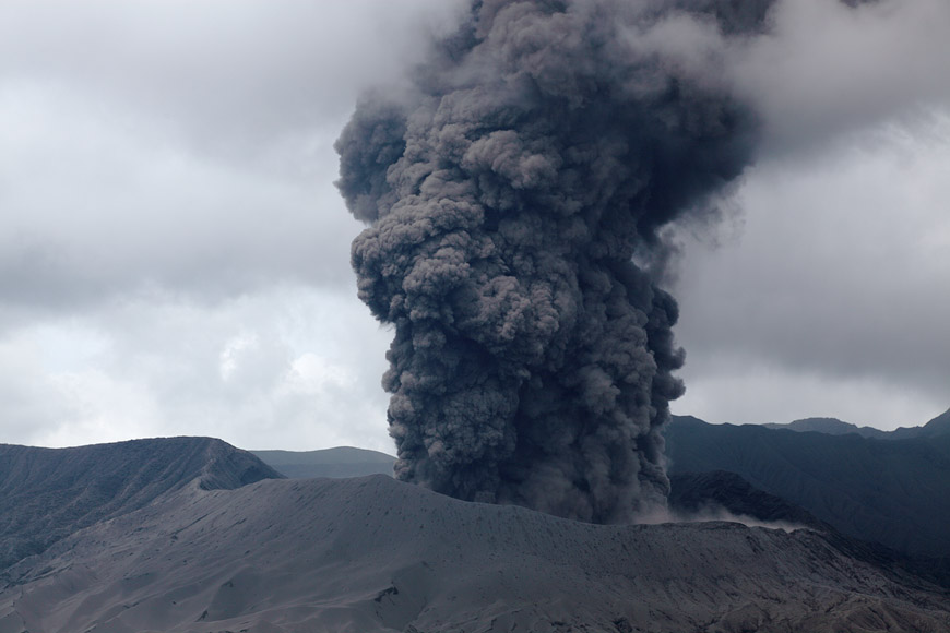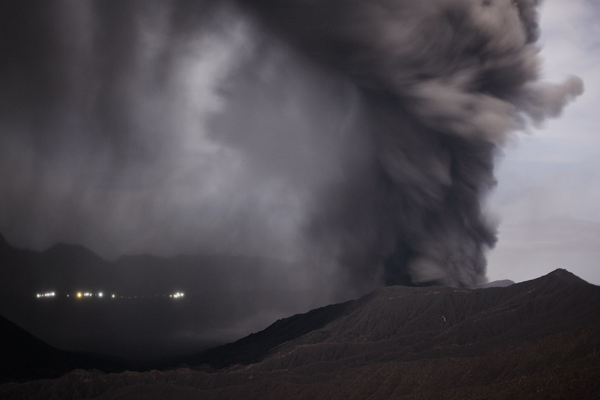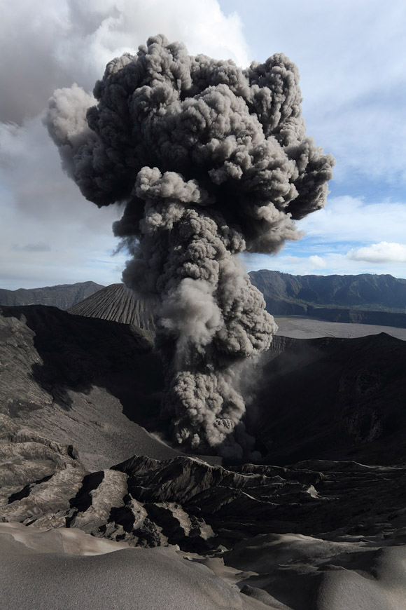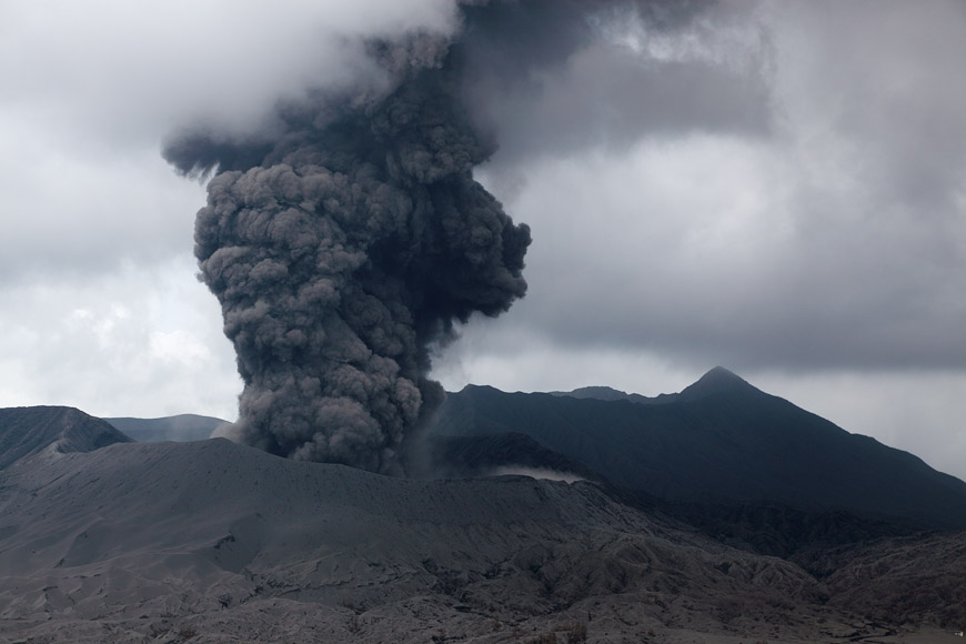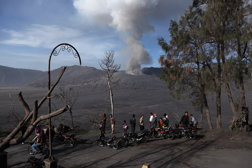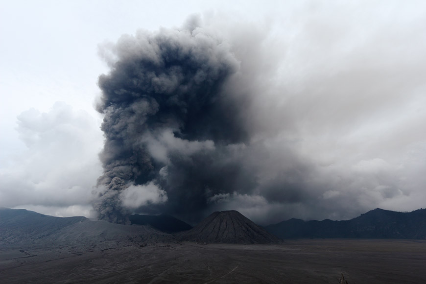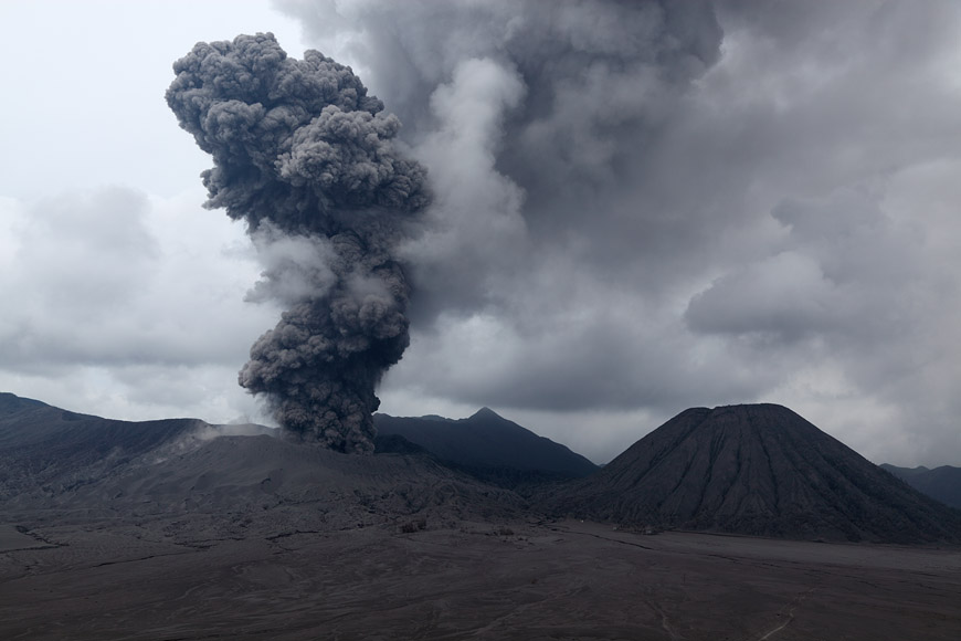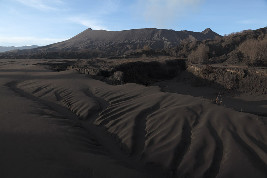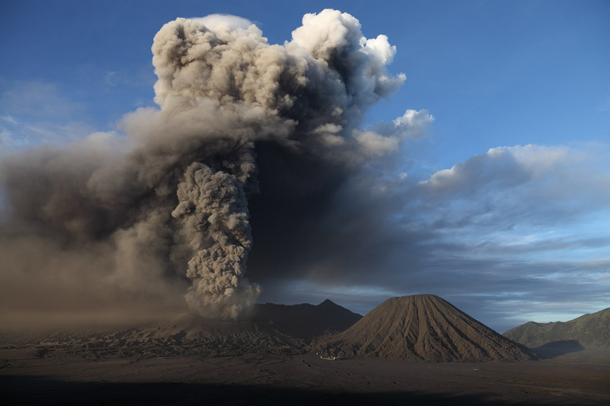 Bromo Temple below Mt. Batok (lower middle) gives scale