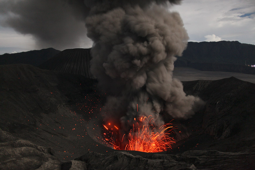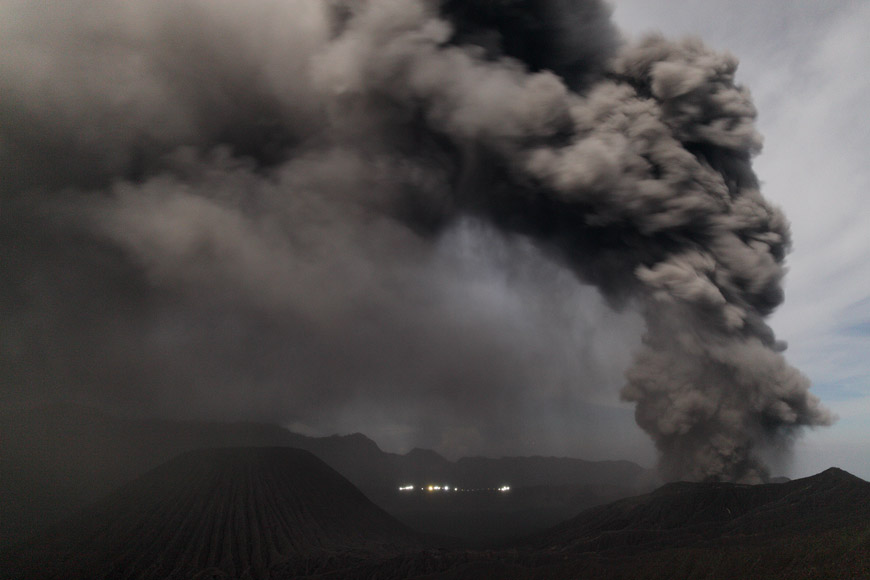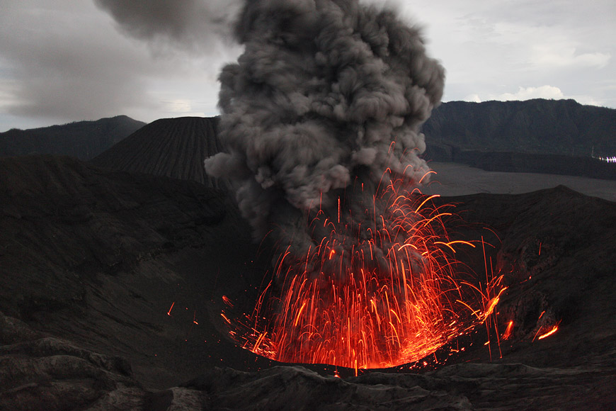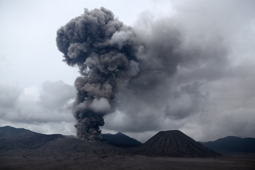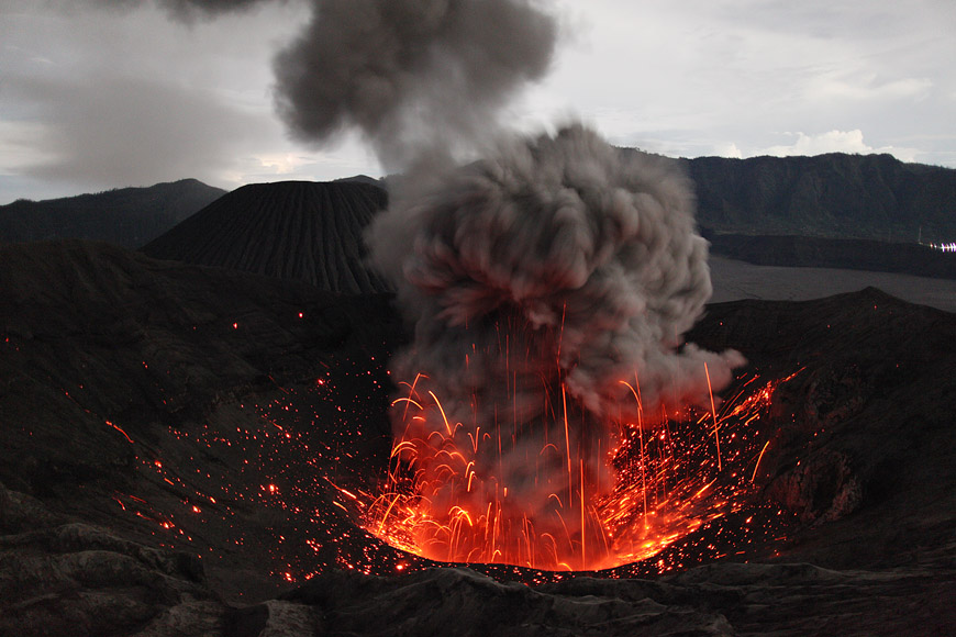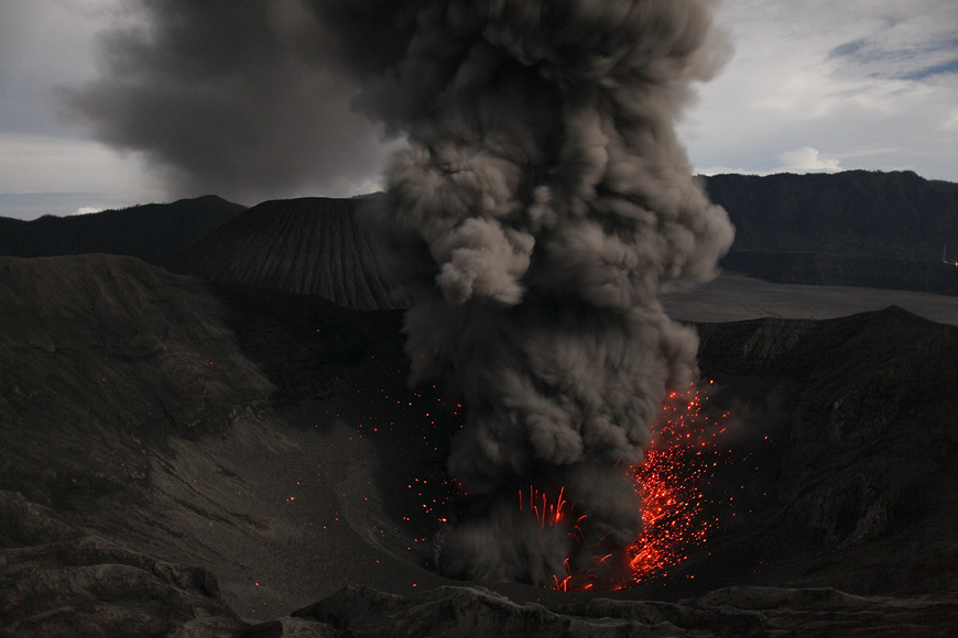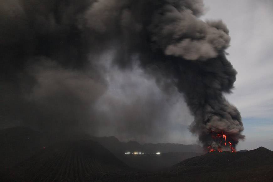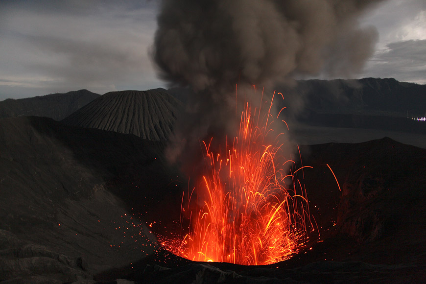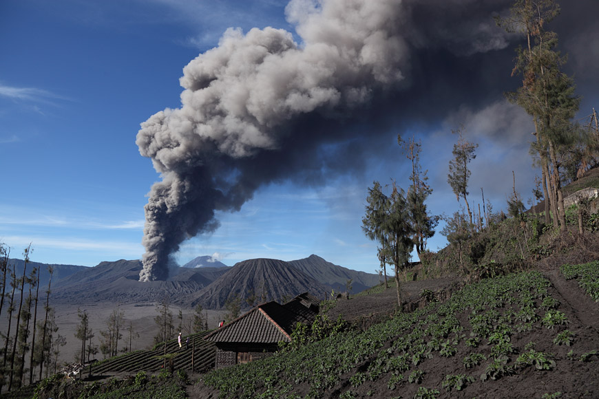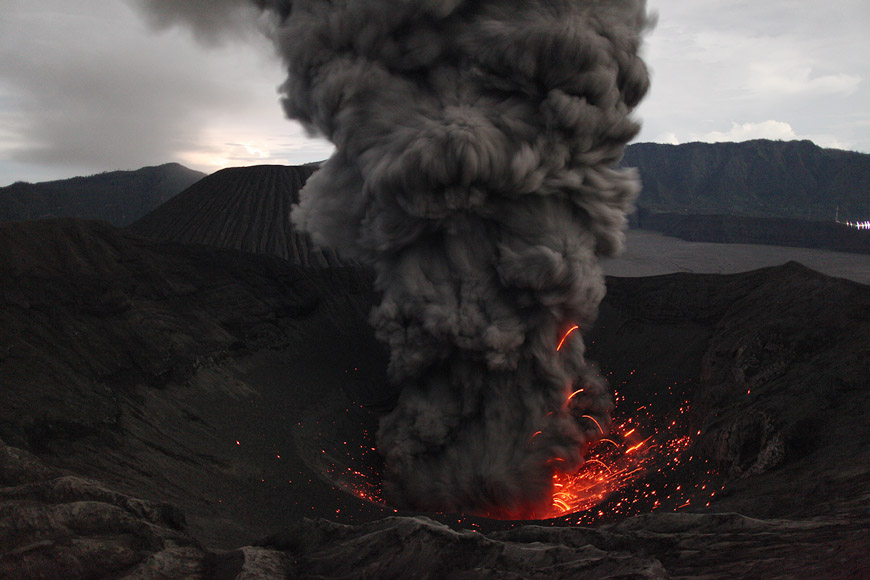 Bromo Temple below Mt. Batok (lower middle) gives scale