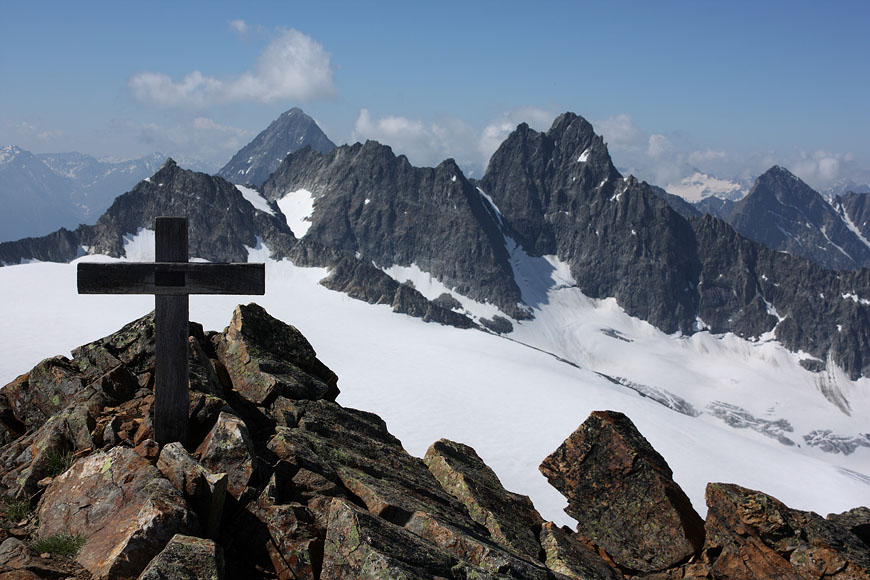 Day tour from Tiefenbachferner road, 3,5h ascent via s-ridge, easy climb (grade I), summit rock very exposed.