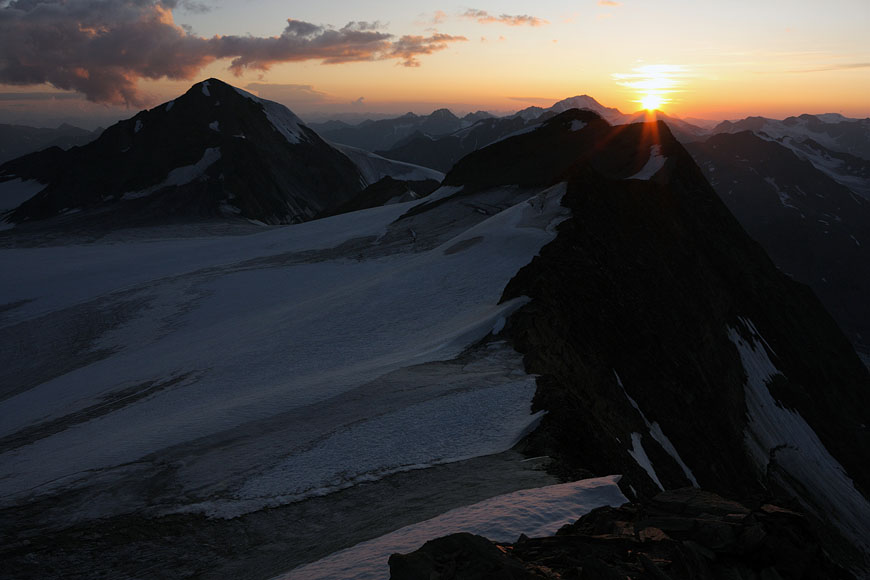1.th day: 4h ascent to Mittlere Marzellspitze (3530m) via S-flank, crossing Östliche Marzellspitze (3555m) and climbing Hintere Schwärze via W-ridge, easy climb (two steps grade II), later tent-night 20m below Mitt. Marzellspitze.