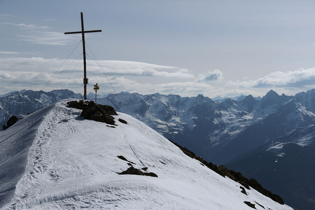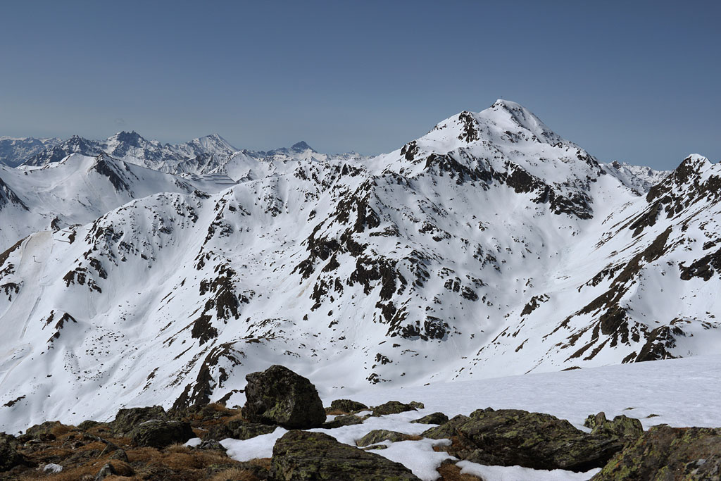 Day tour from Samnaun, easy climb via N-ridge, down via SW-ridge, extremely snowless for this time of the year.