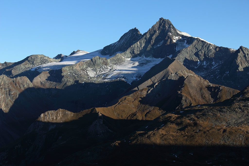 Ht. Modereck (2932m), Herbertturm (2971m), Noespitze (3010m), Krummelkeeskopf ( 3103m), Hocharn (3254m), Goldzechkopf (3072m). Descent via Kl.-fleißtal. Easy climb (grade I), but partly brittle and steep due to excessive glacial retreat.