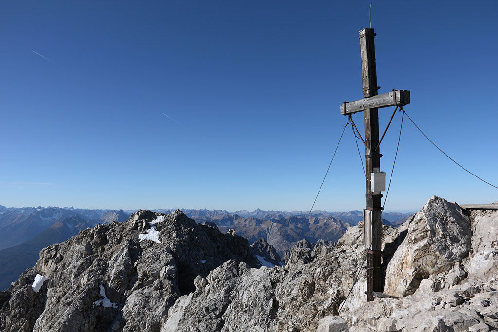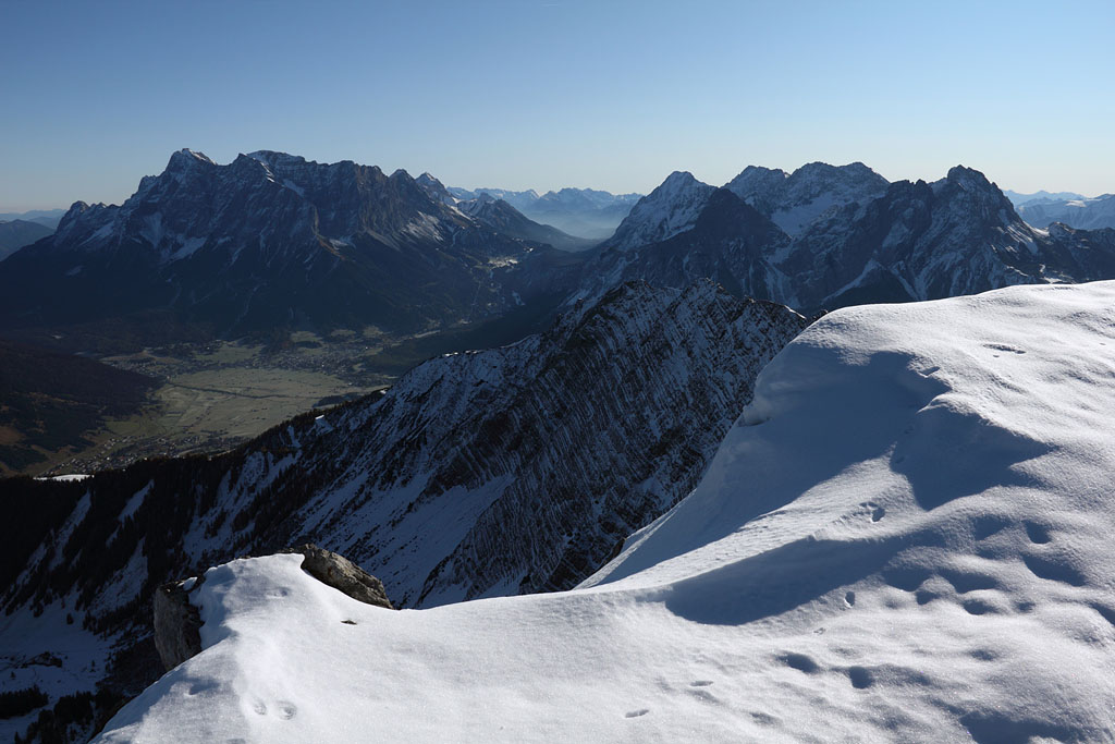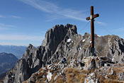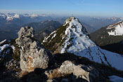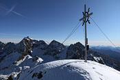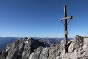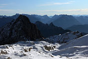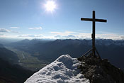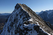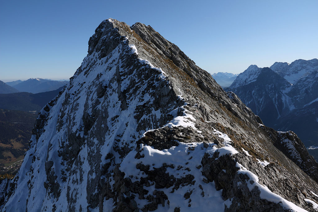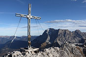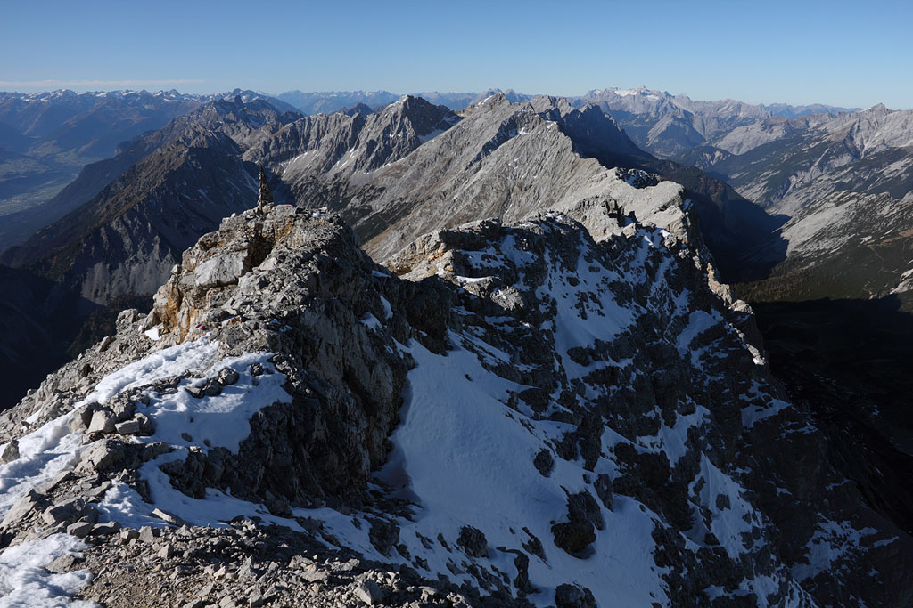 Day tour, ascent from Scharnitz partly with bike, W-ridge fixed rope route, partly icy snow, otherwise easy climb.