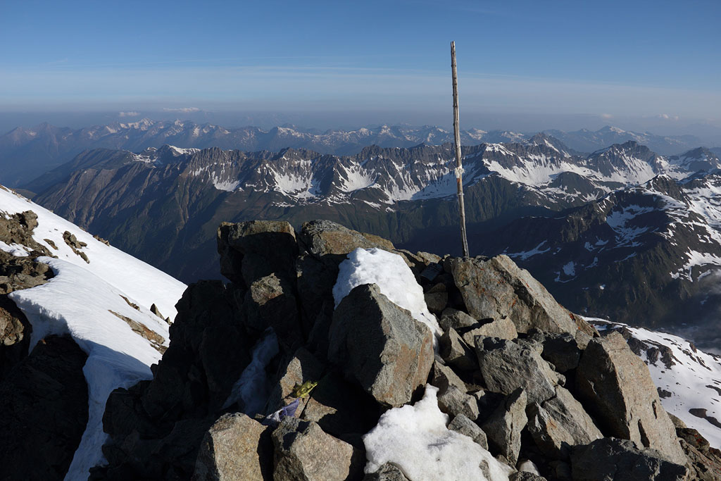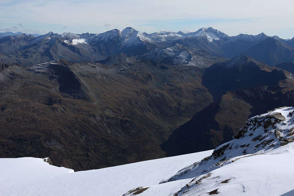 Day tour, ascent from Mölltaler Glacier, crossing complete ridge from Fragant Scharte via Schareck, Baumbachspitze (3105m), Strabelebenkopf (3012m) and Weinflaschenkopf (3006m) down to S, easy climb (grade I+), but often deep snow.