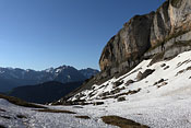 Dangerous due to heavy rockfall caused by meling of fresh snow and unavoidable crossing of coloirs.