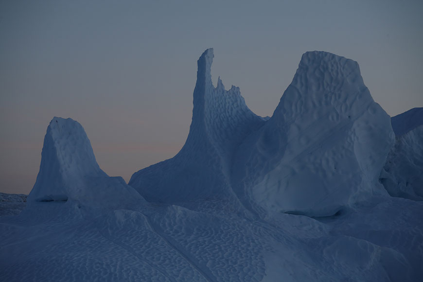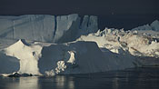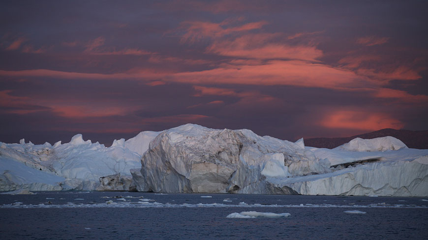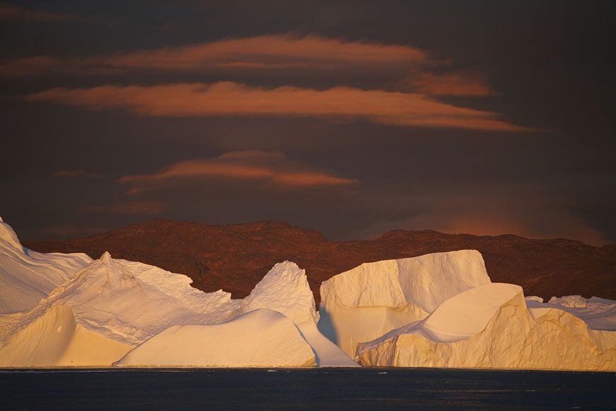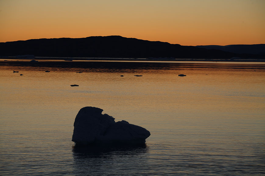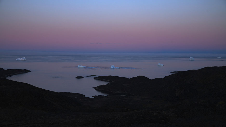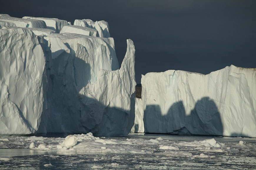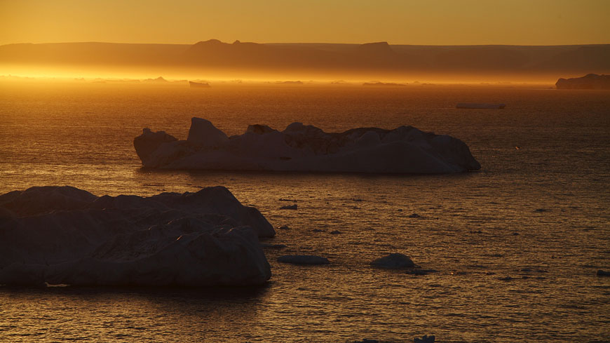 earth's shadow with drifting icebergs seen while climbing Lyngmarksbreen summit in early morning |