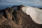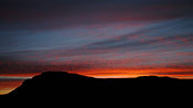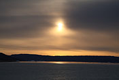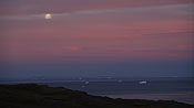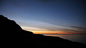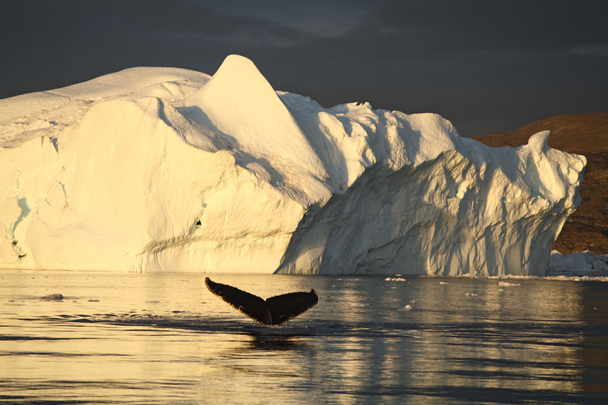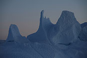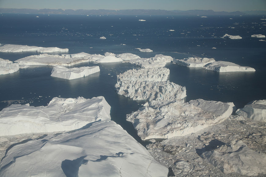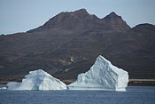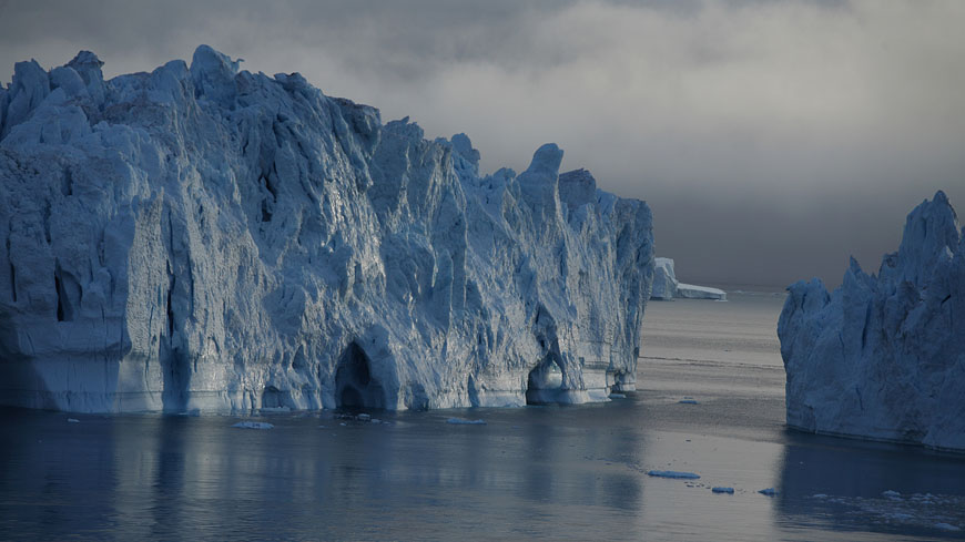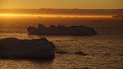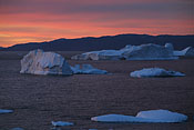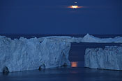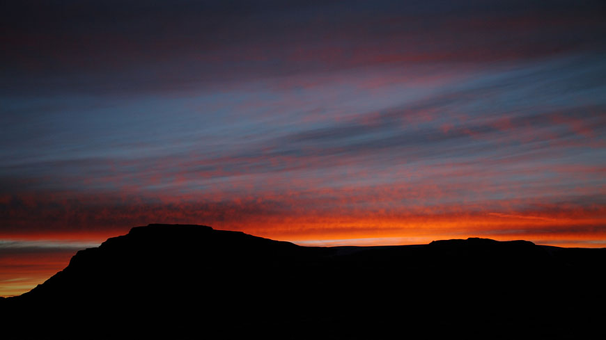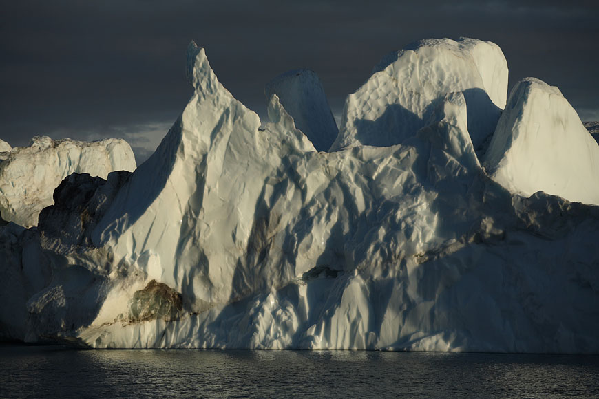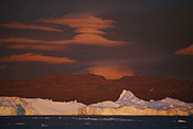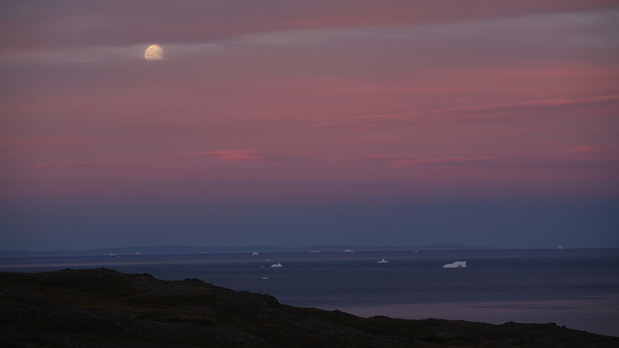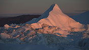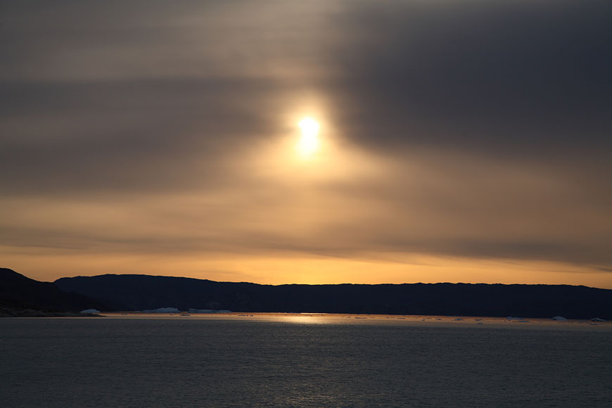 earth's shadow with drifting icebergs seen while climbing Lyngmarksbreen summit in early morning |