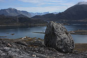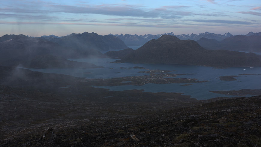 making extended walks around Nanortalik island, Nanortalic village below (mid of image) while waiting for chartered Inuit boat |