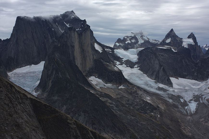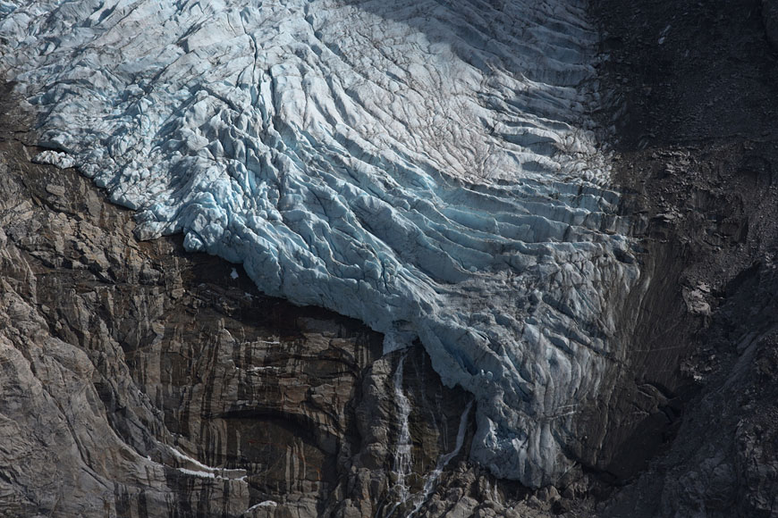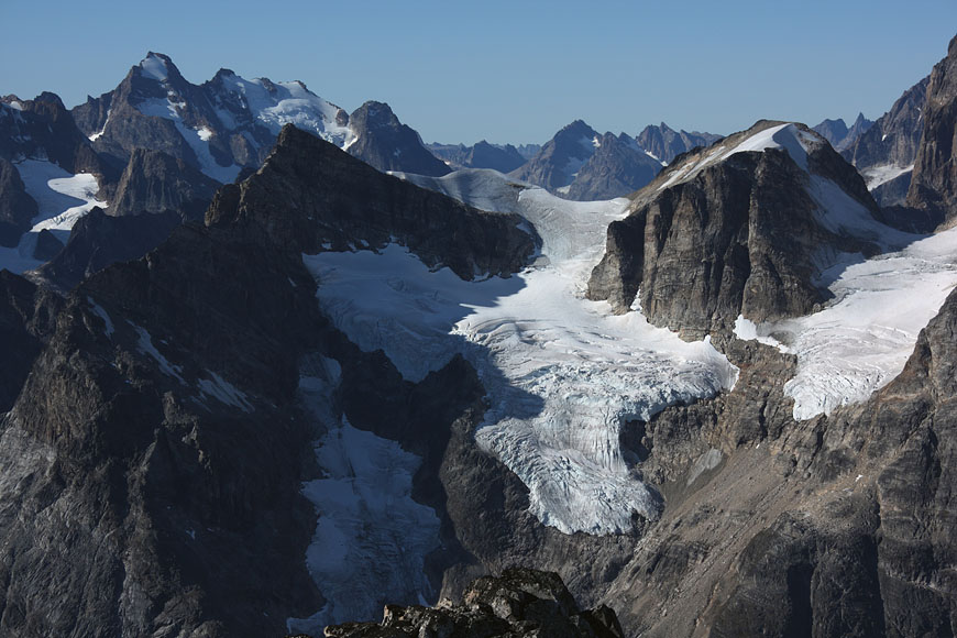 glaciers defying gravity on top of 1000m rock walls |