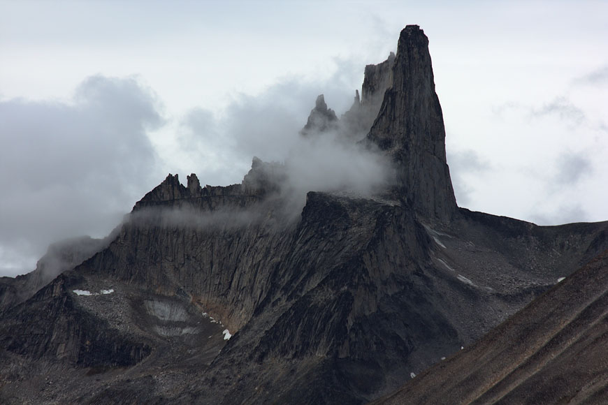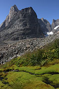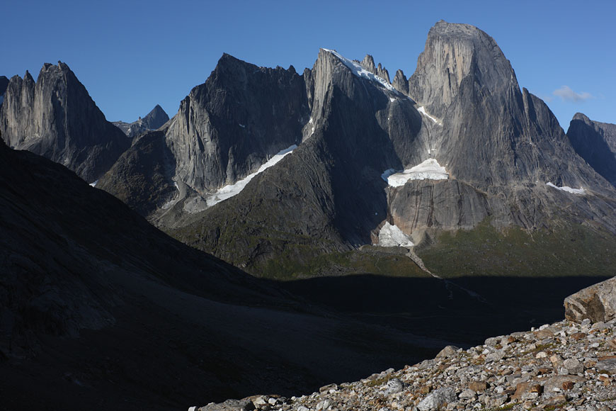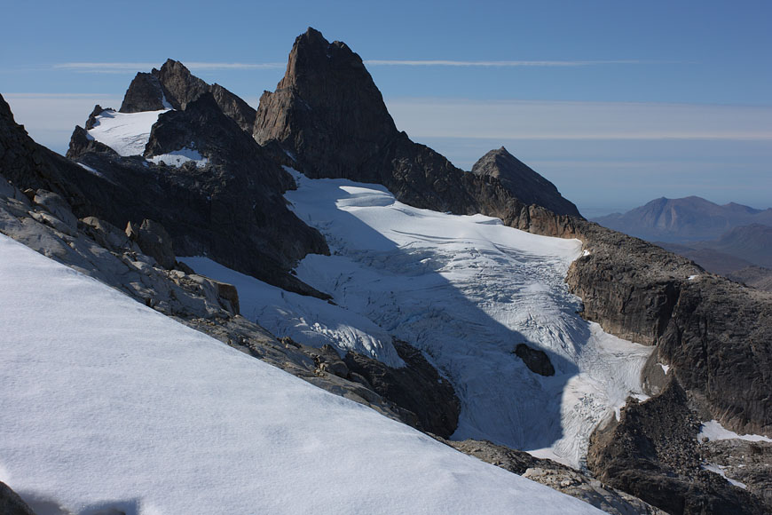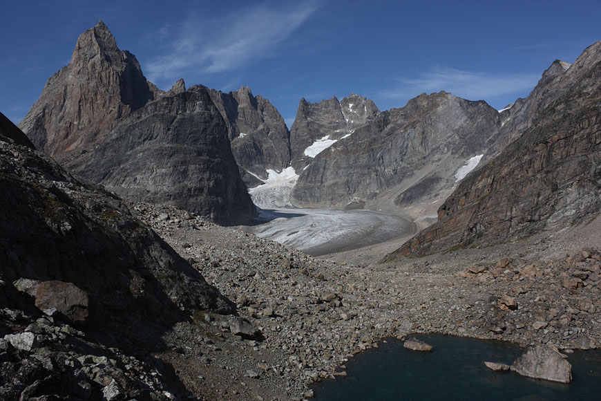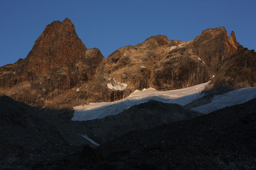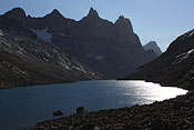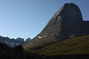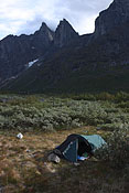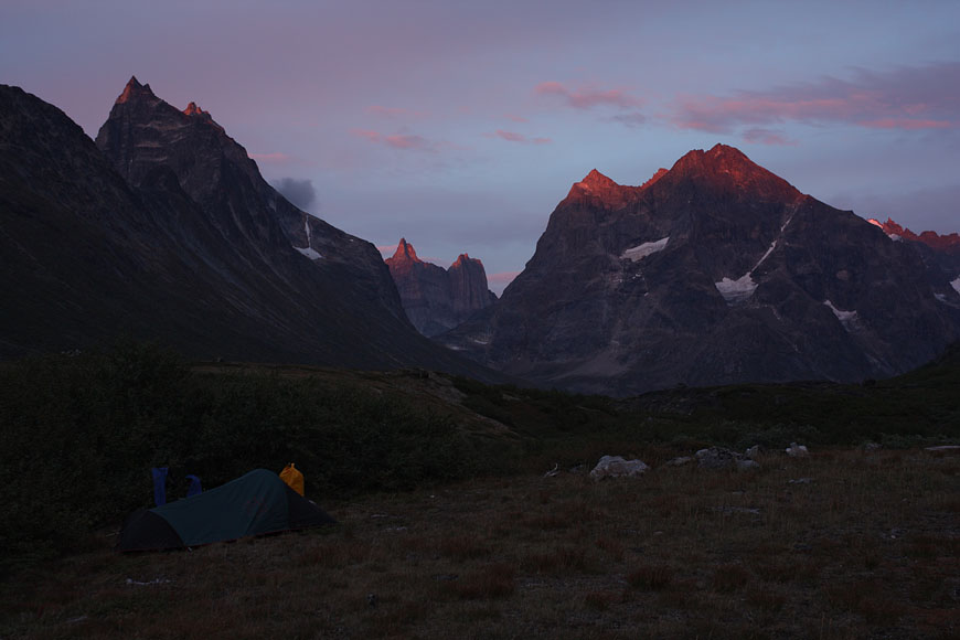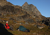 campsite after a long, strenuous day below towering Tininnertuup Qaqqaat summit, crossed pass behind |