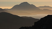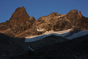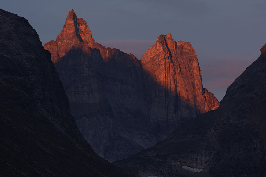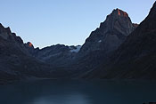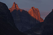 steep mountaintops catching first sunlight |
