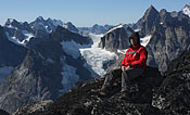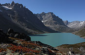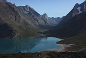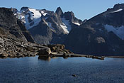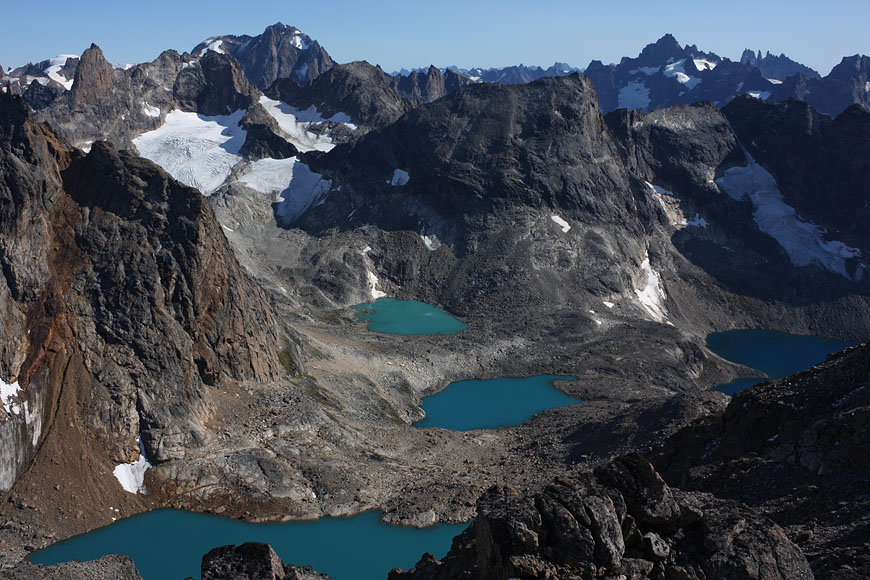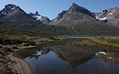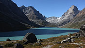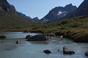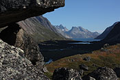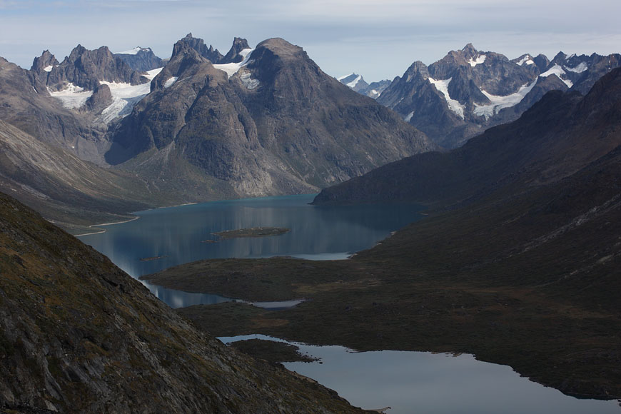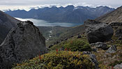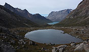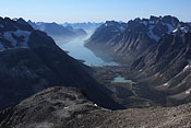 after reaching the upper Itillersuaq valley and beeing sure to reach the not too far away Inuit village I took another day off for climbing an unnamed 1100m peak having a beautiful sight back to the successfully crossed mountainrange with its colorful lakes |