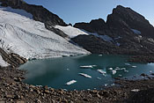 ascending to the next pass for reaching Qinnguadalen was easy, but circumnavigating its lake meant dealing with a dangerous steep and icy part |