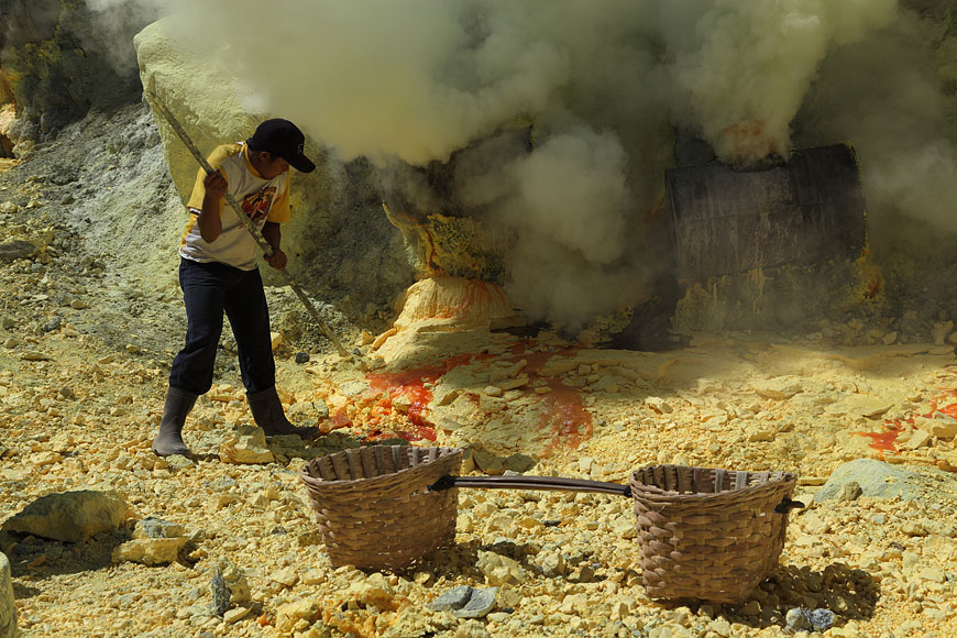 worker breaking up sulfur, carrying basked nearby |