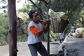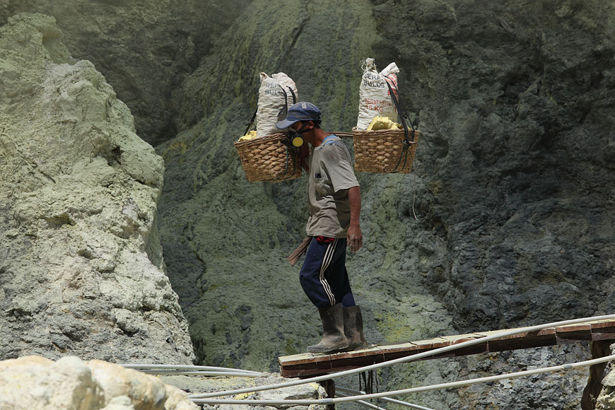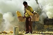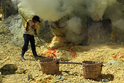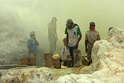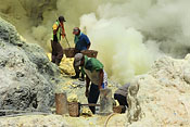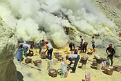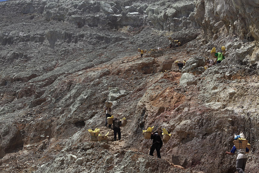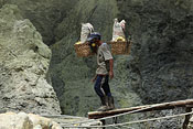 workers with sulfur baskets climbing the craters wall |