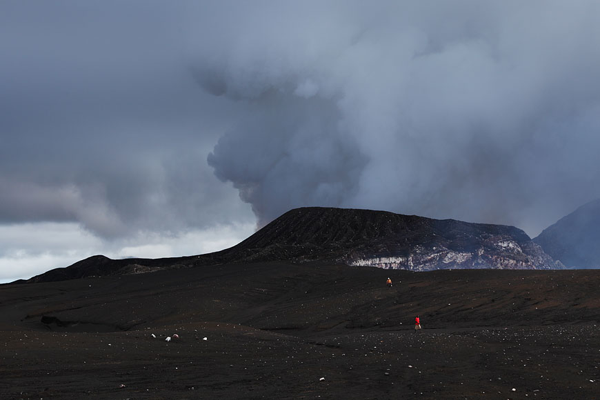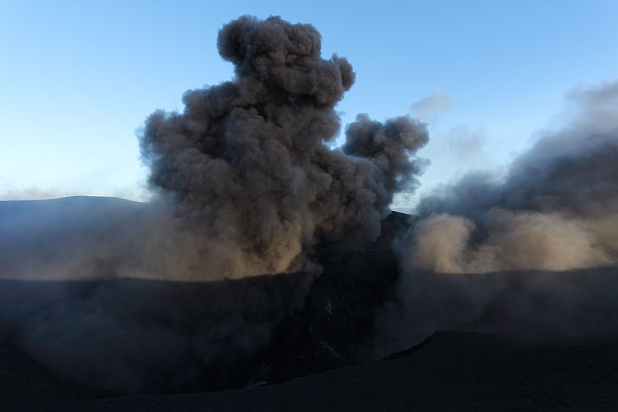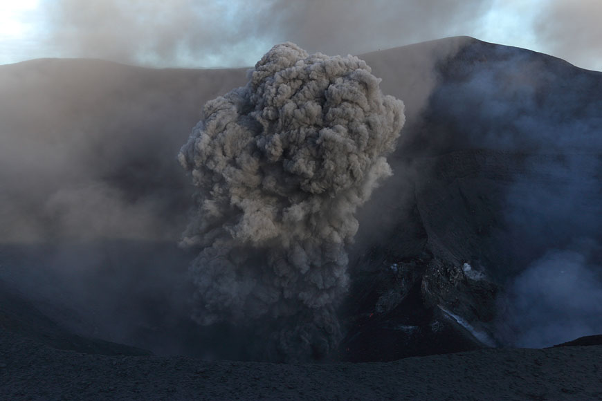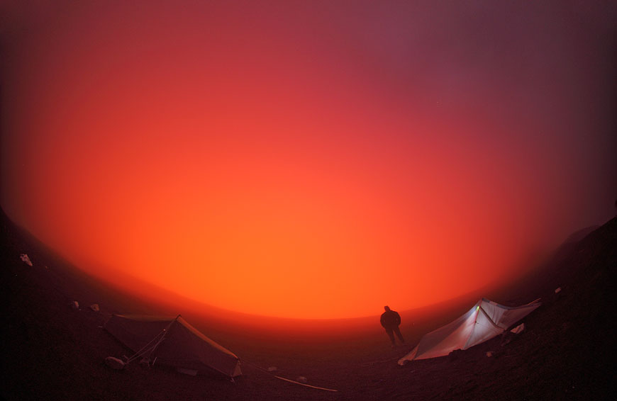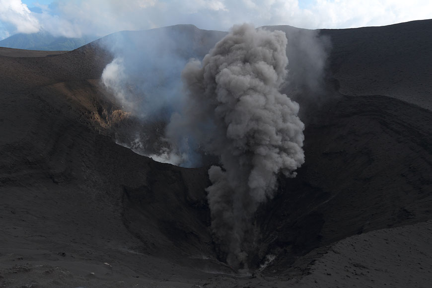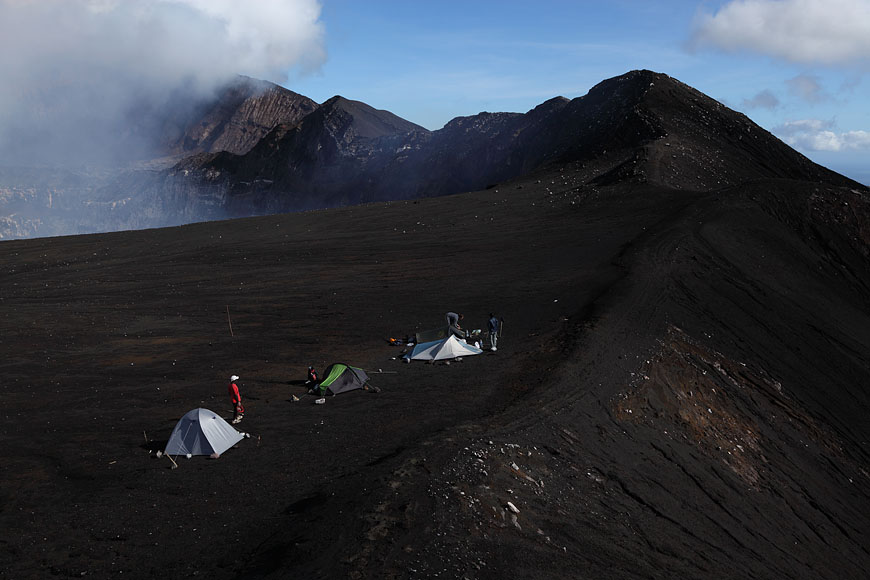 often sulphuric gasses filling the steep crater, our tents are visible behind to the mid right |