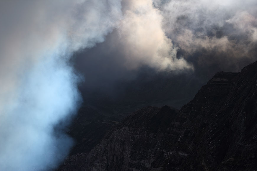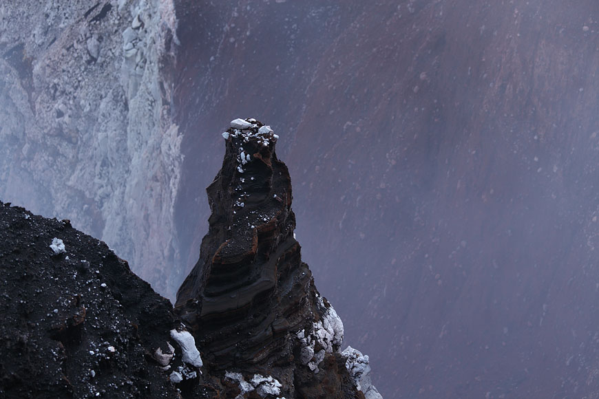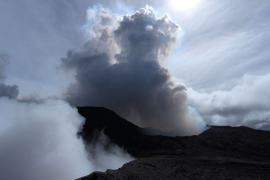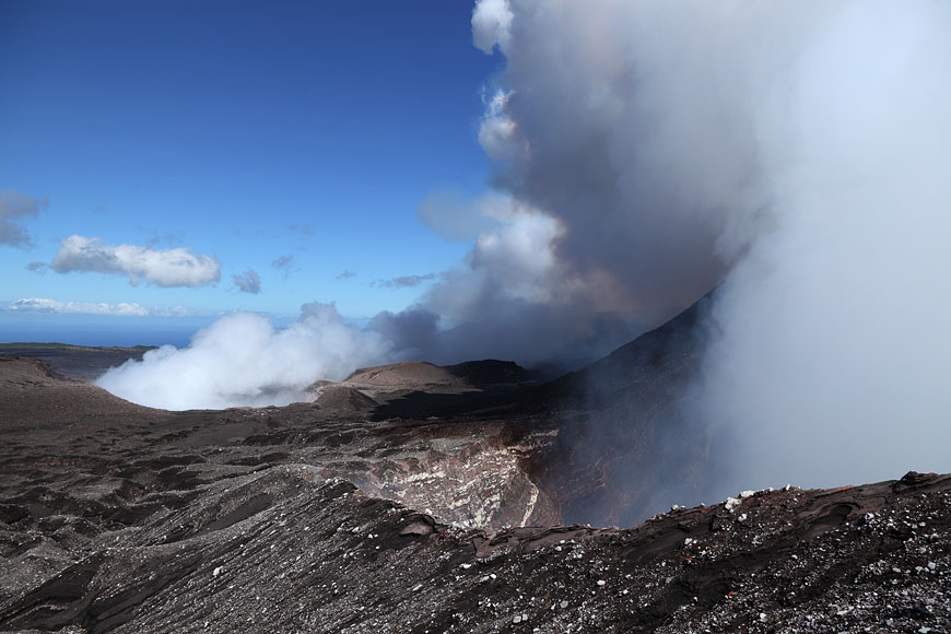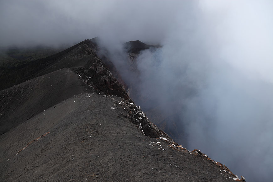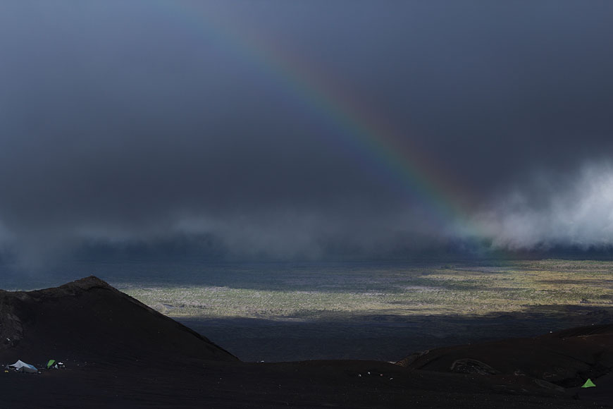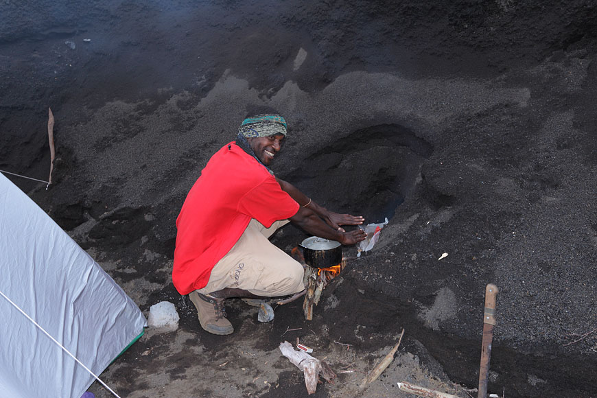 often sulphuric gasses filling the steep crater, our tents are visible behind to the mid right |