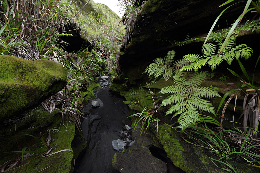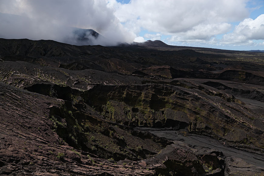 deeper down to the ashplane the eroded crater flanks forming flood gullys |