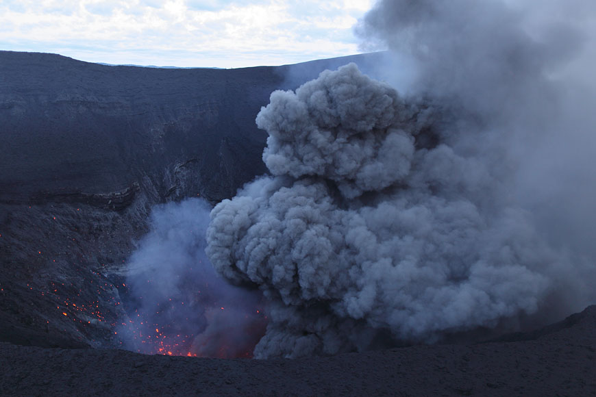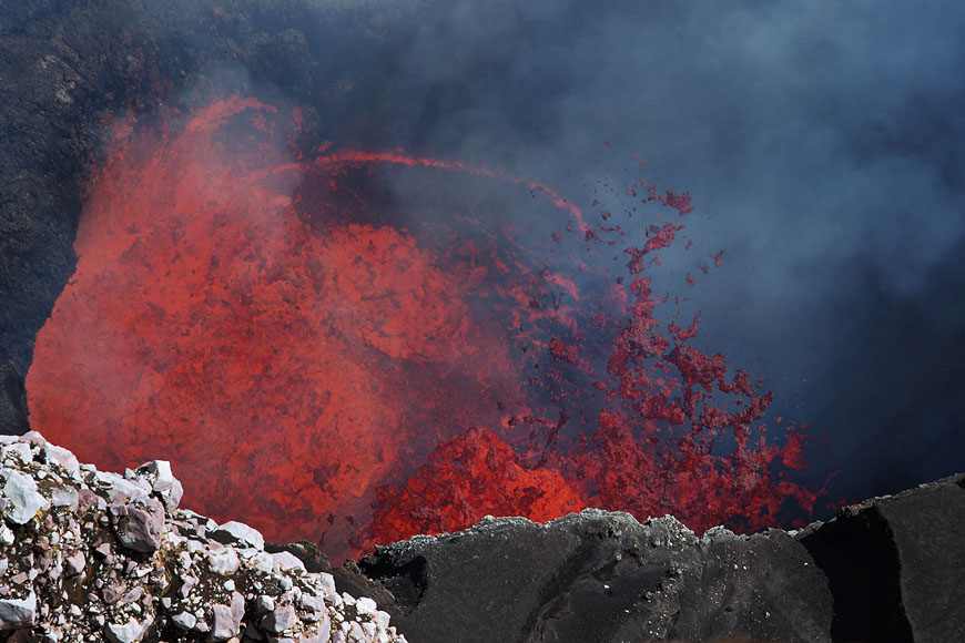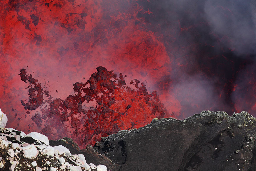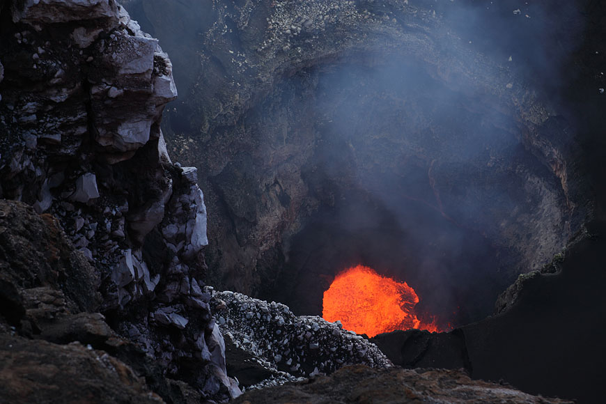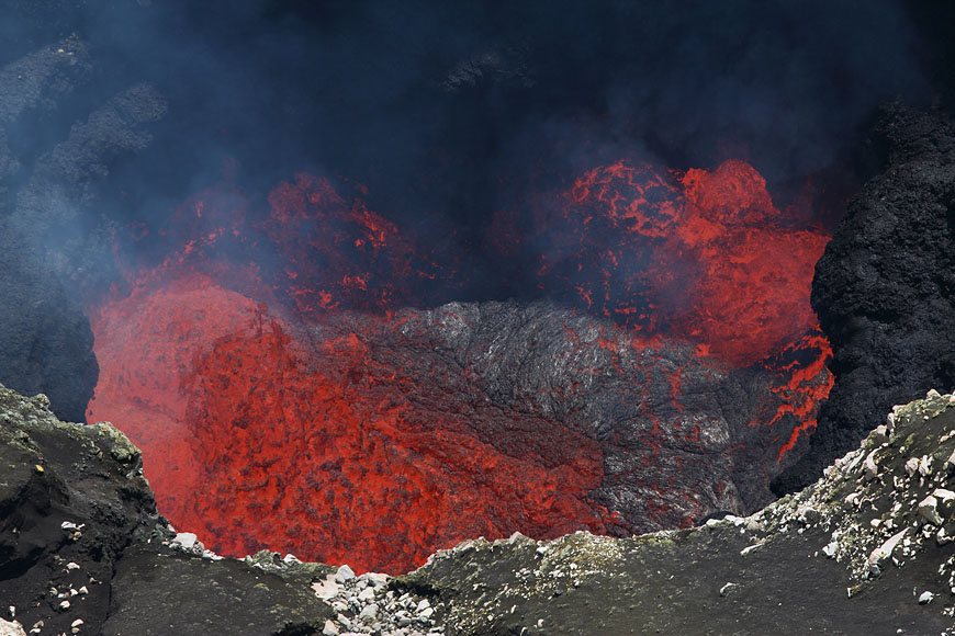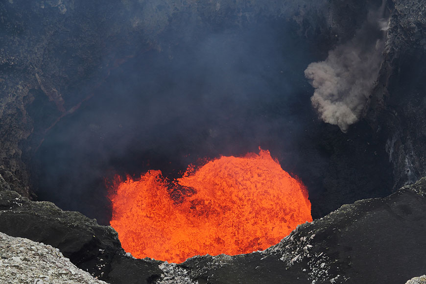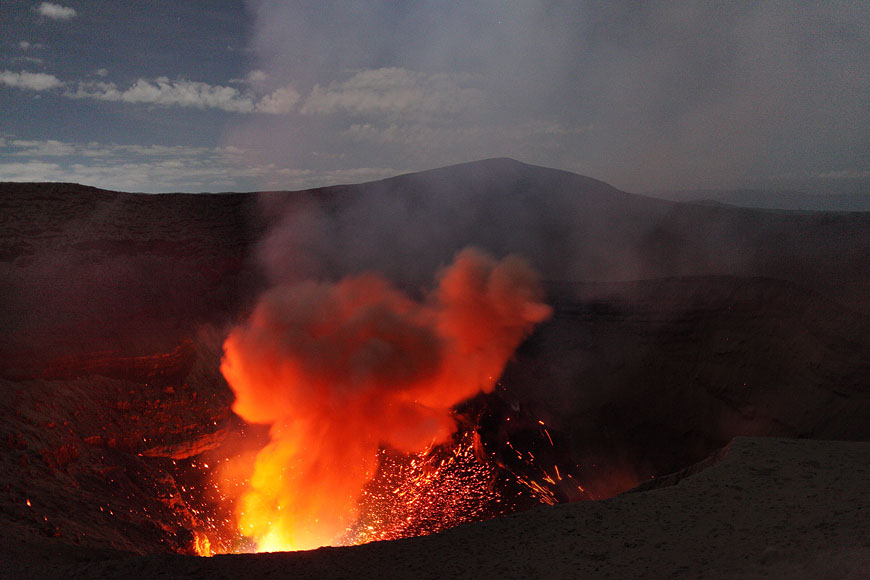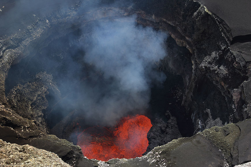 now after each eruption the inner lava lake jumps high above its normal level and greets the observer shortly |