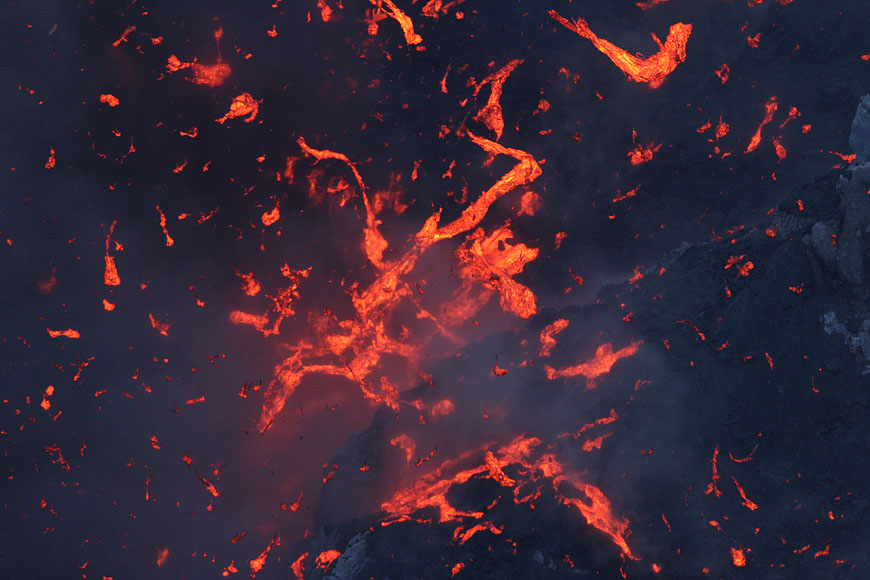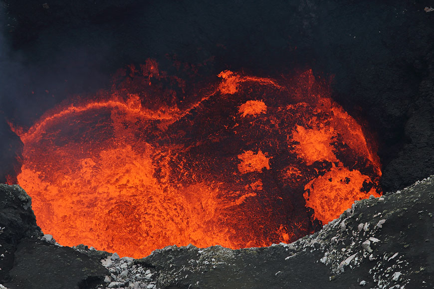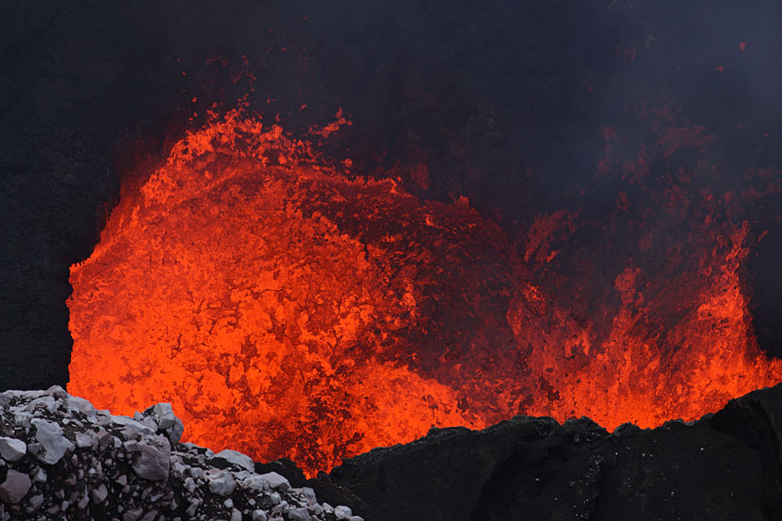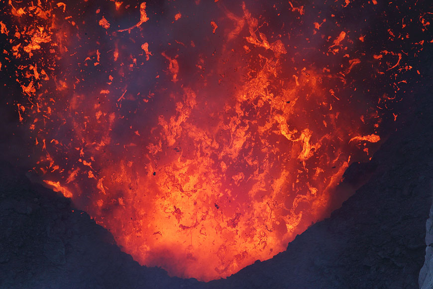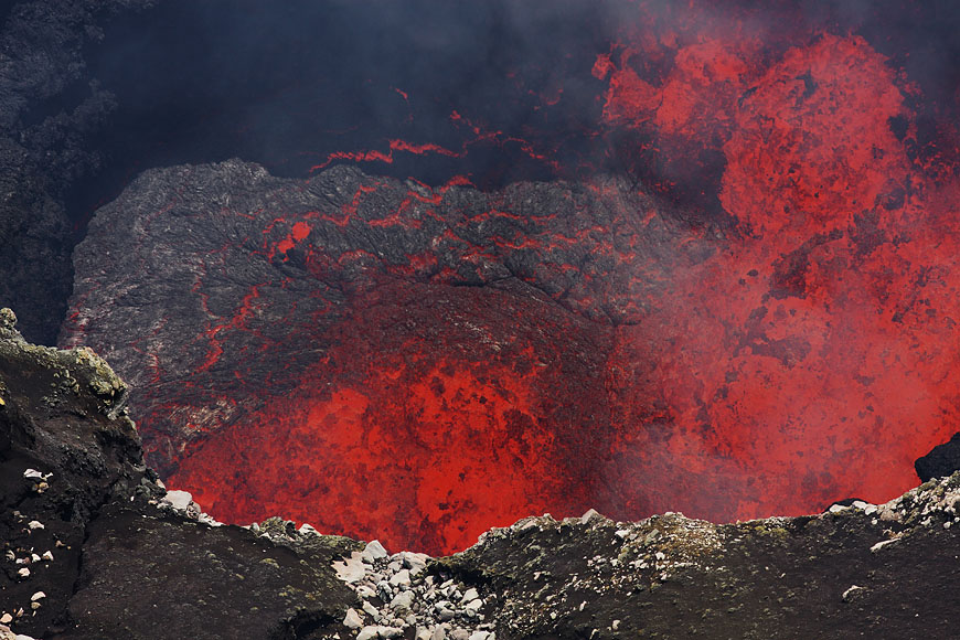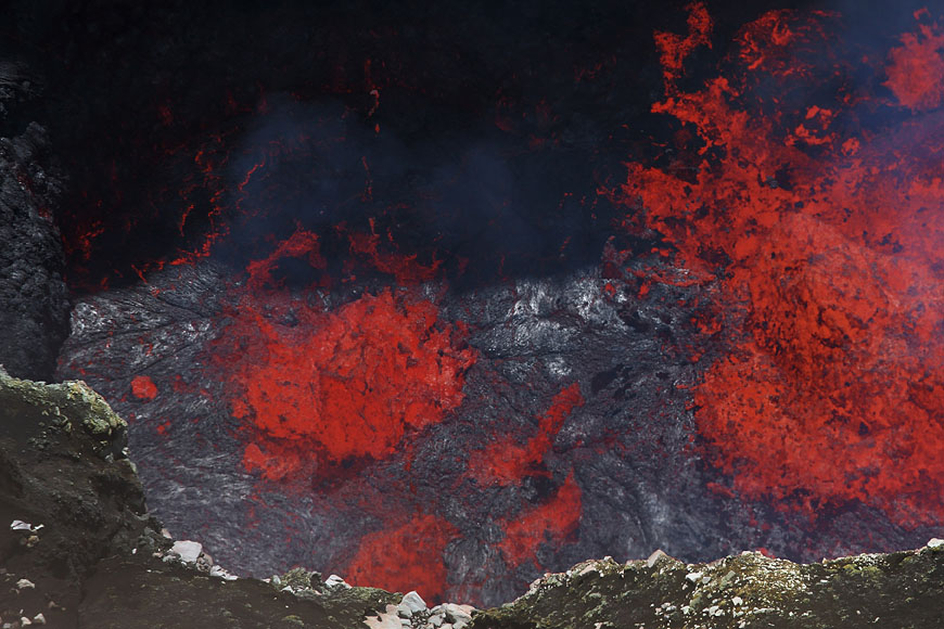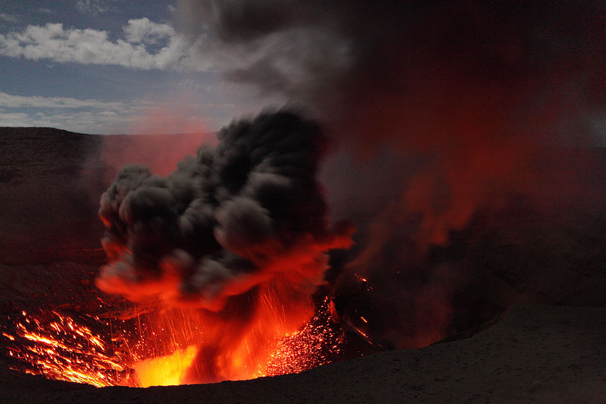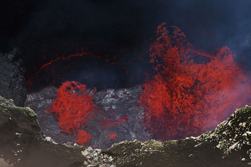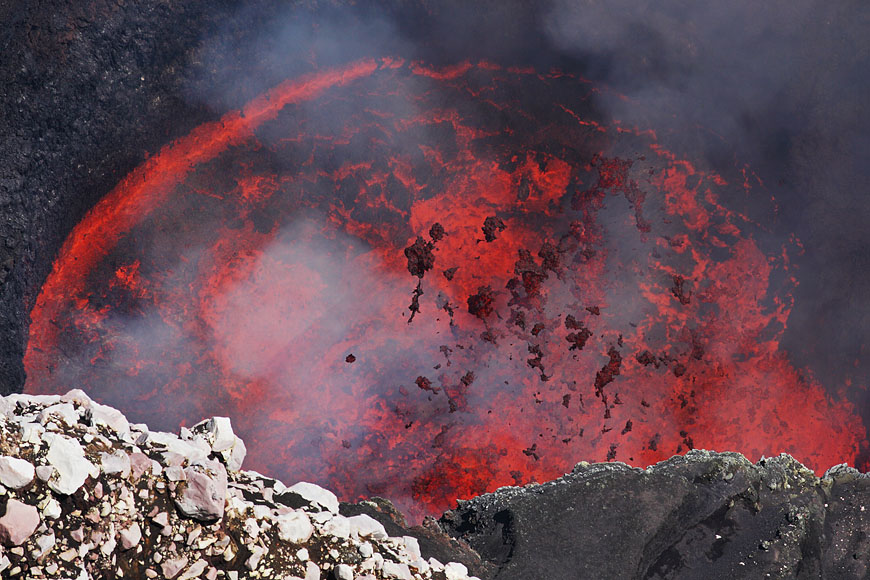 now after each eruption the inner lava lake jumps high above its normal level and greets the observer shortly |