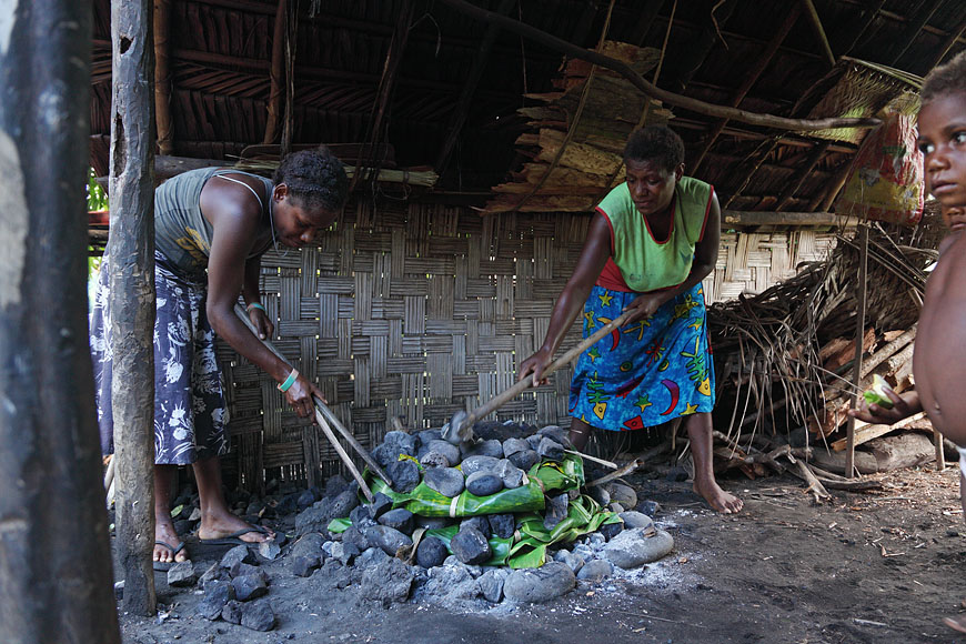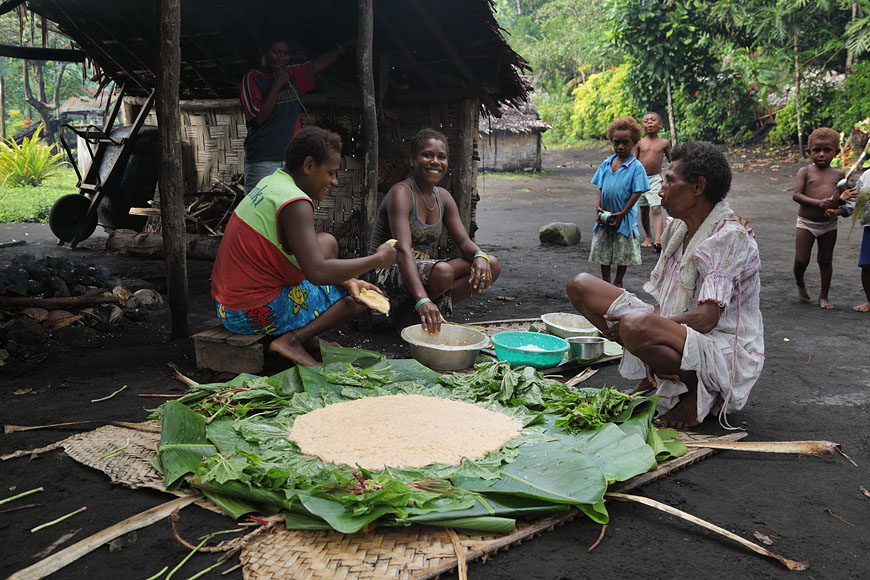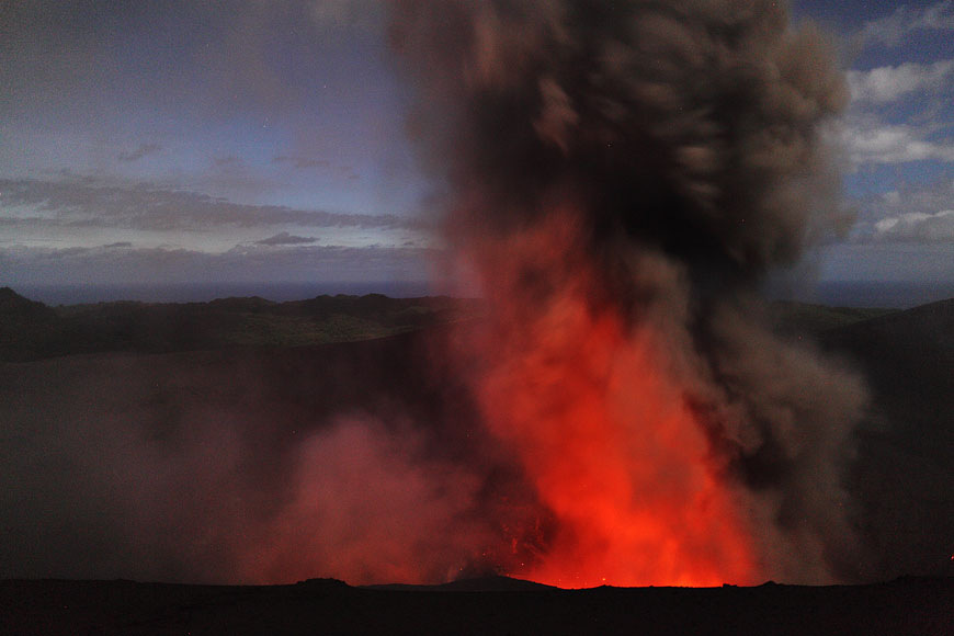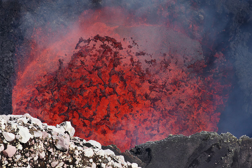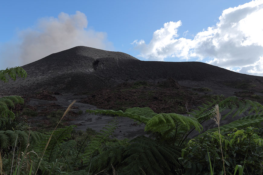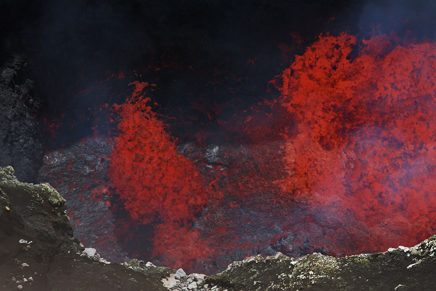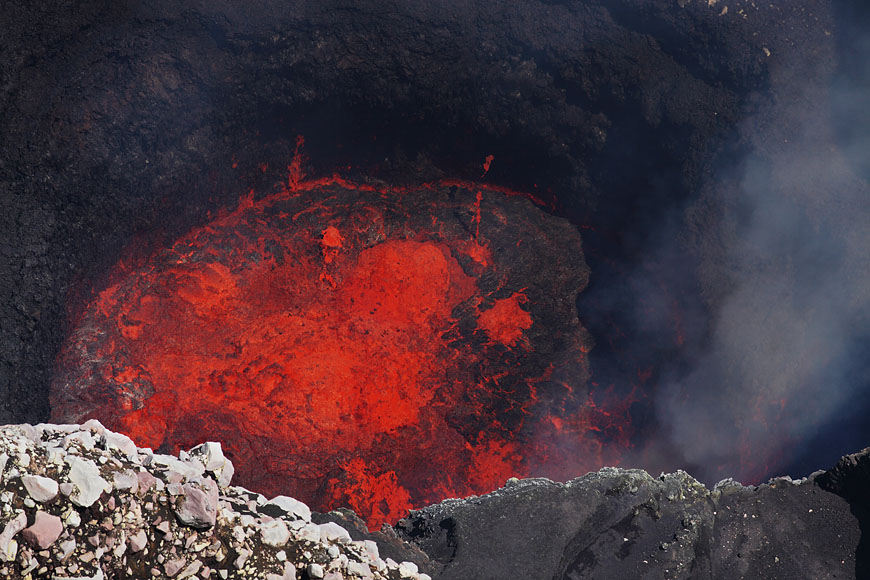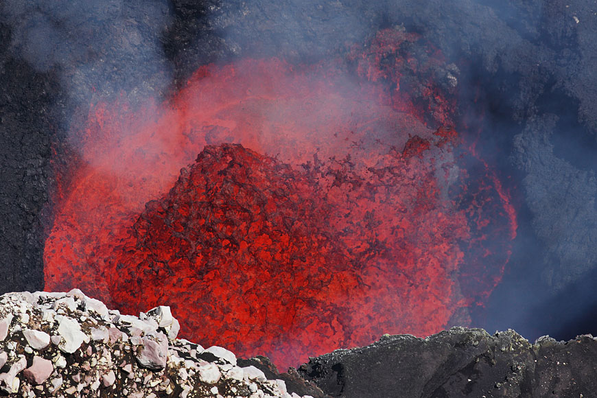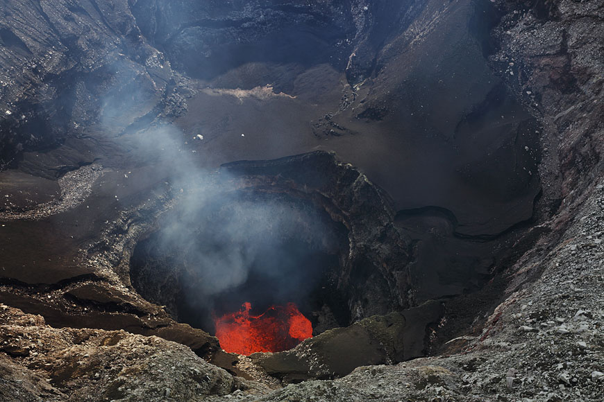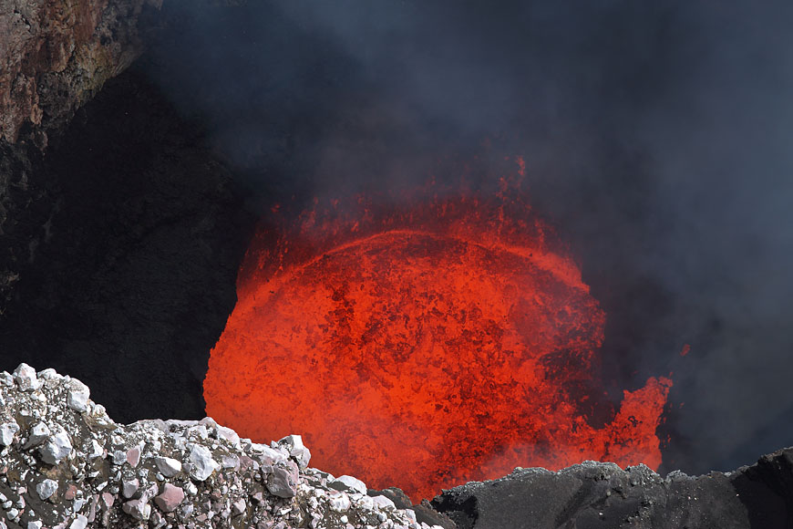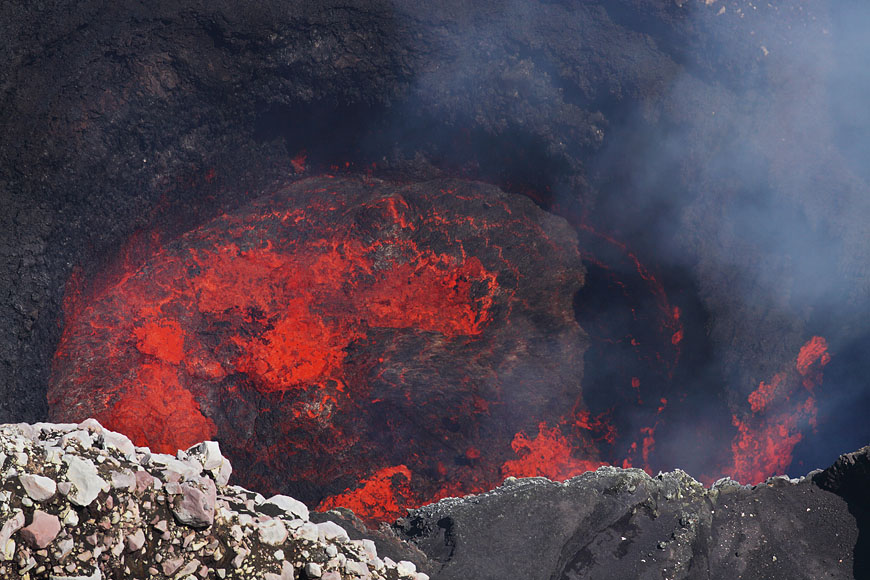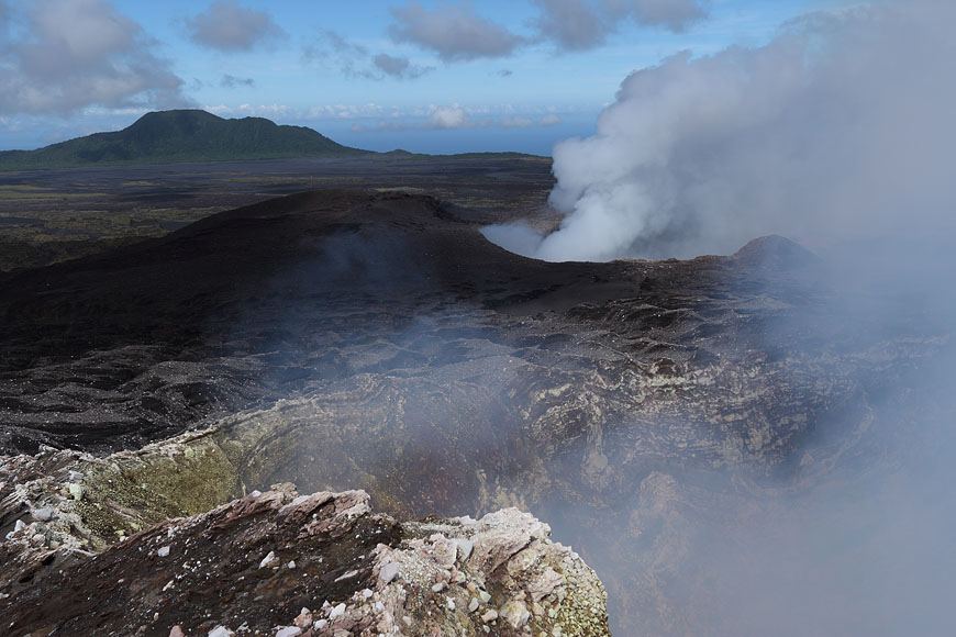 the Marum volcano has many side craters, one with a very low level lava pond inside to the right |
