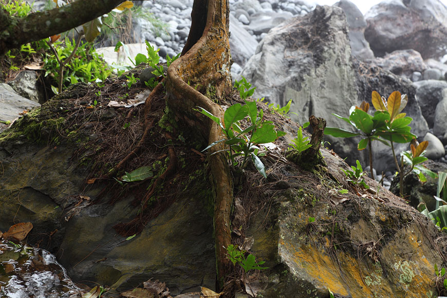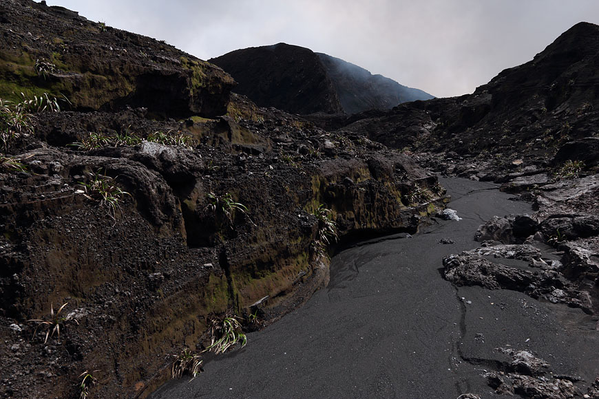 bizarre ash landscape at the craters flanks eroded by heavy rainfall |