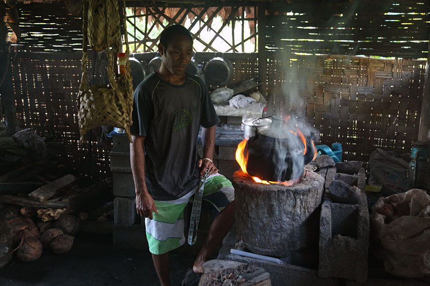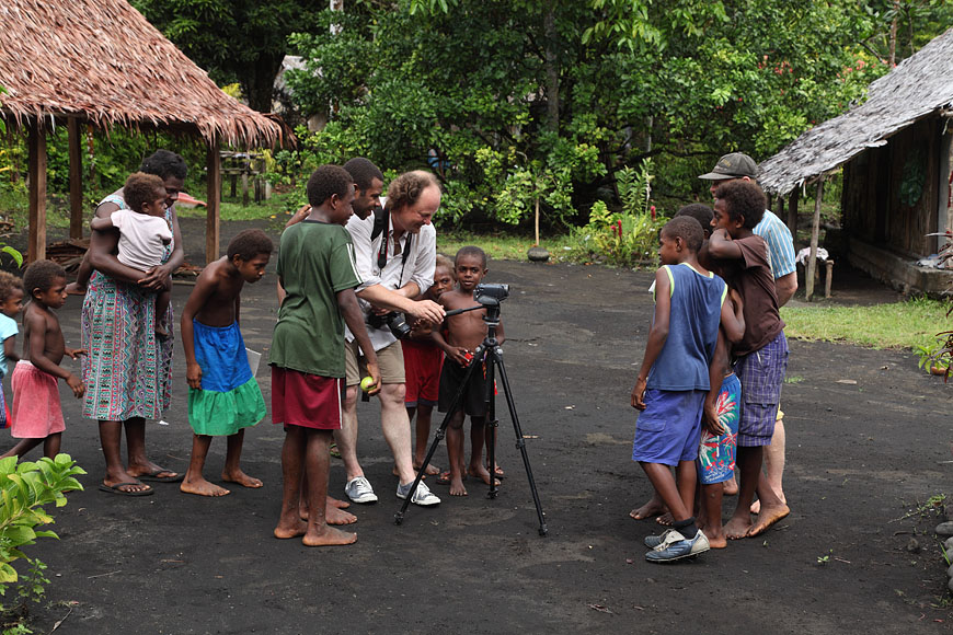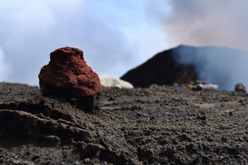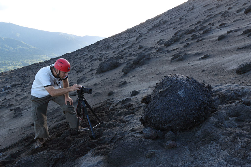Arnold photographing recently fallen and still hot lava bomb at Yasurs outer flank |