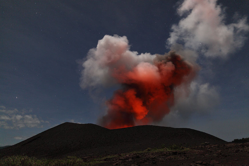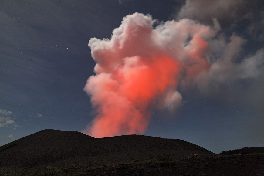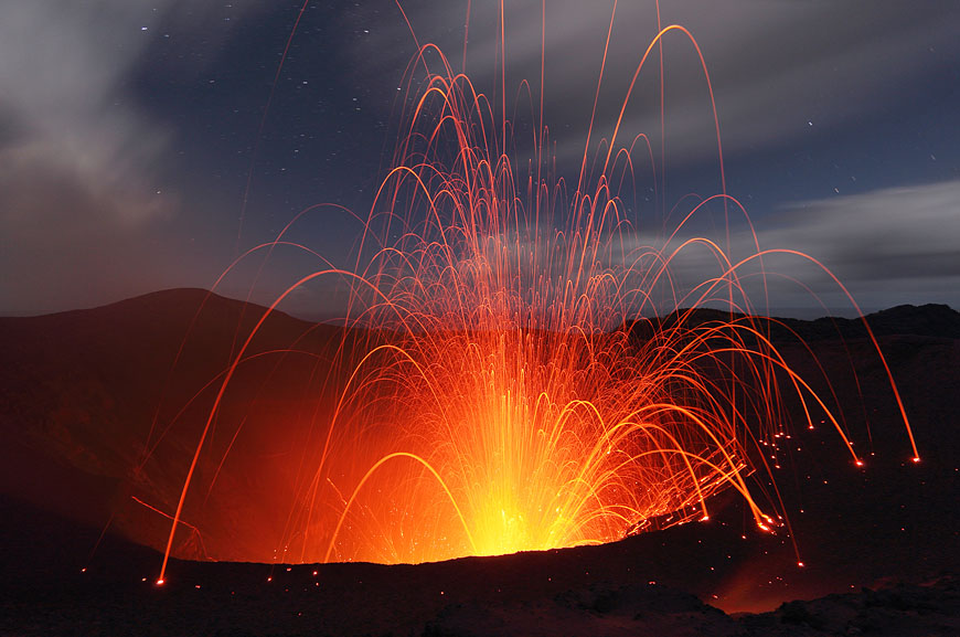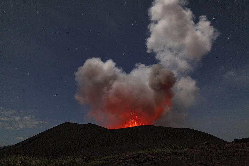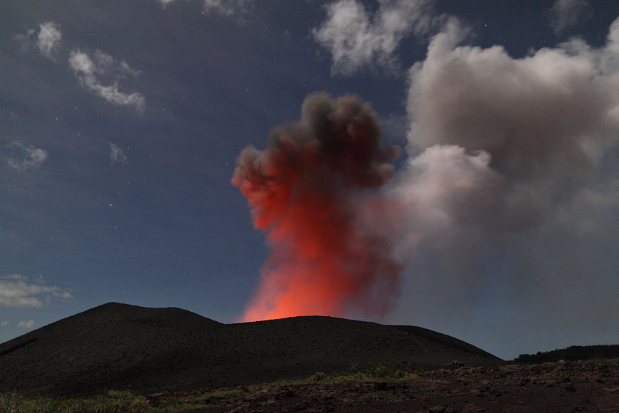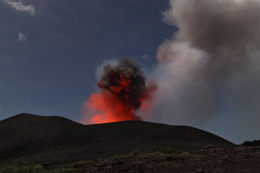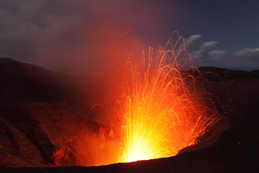strombolian eruption with bright meteor above, a nice spectacle for the eye but nearly too much contrast for the camera |