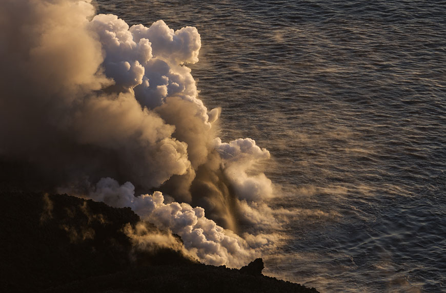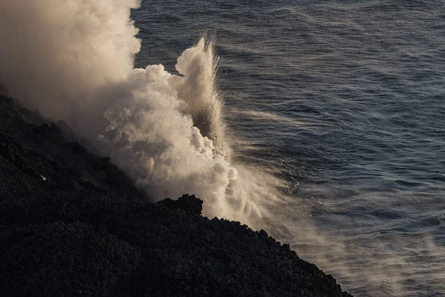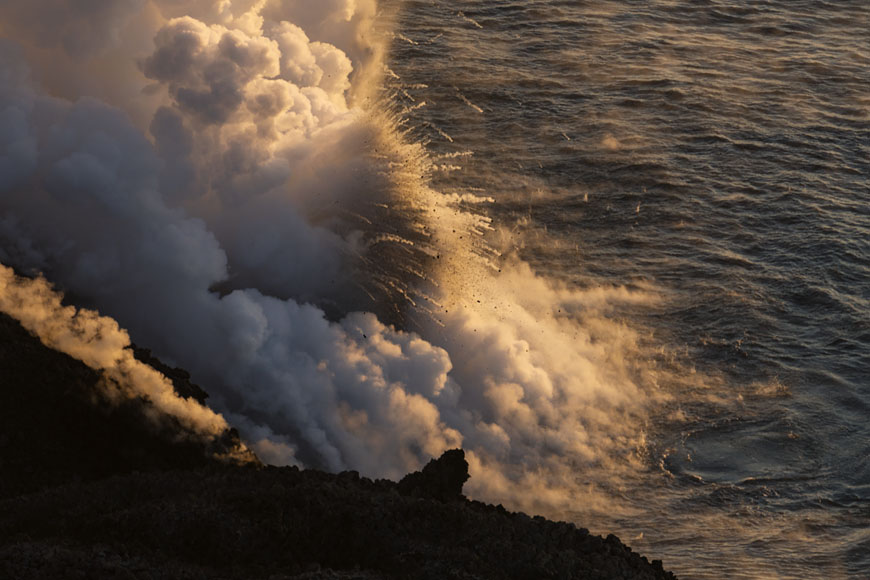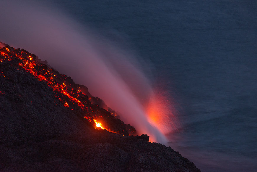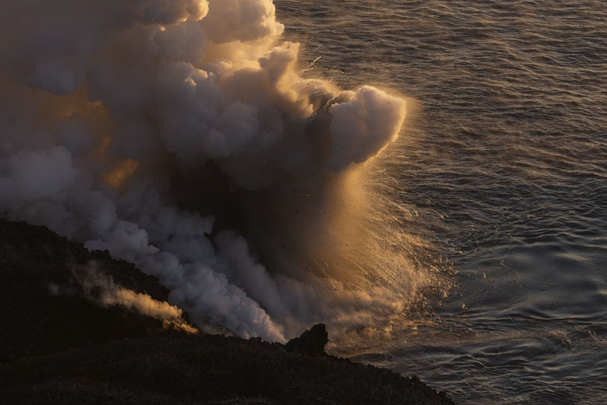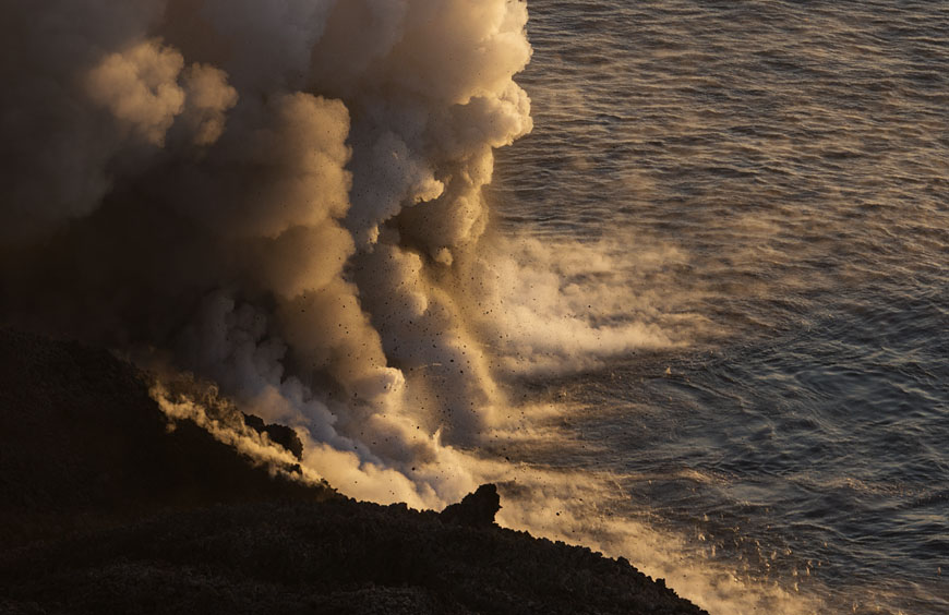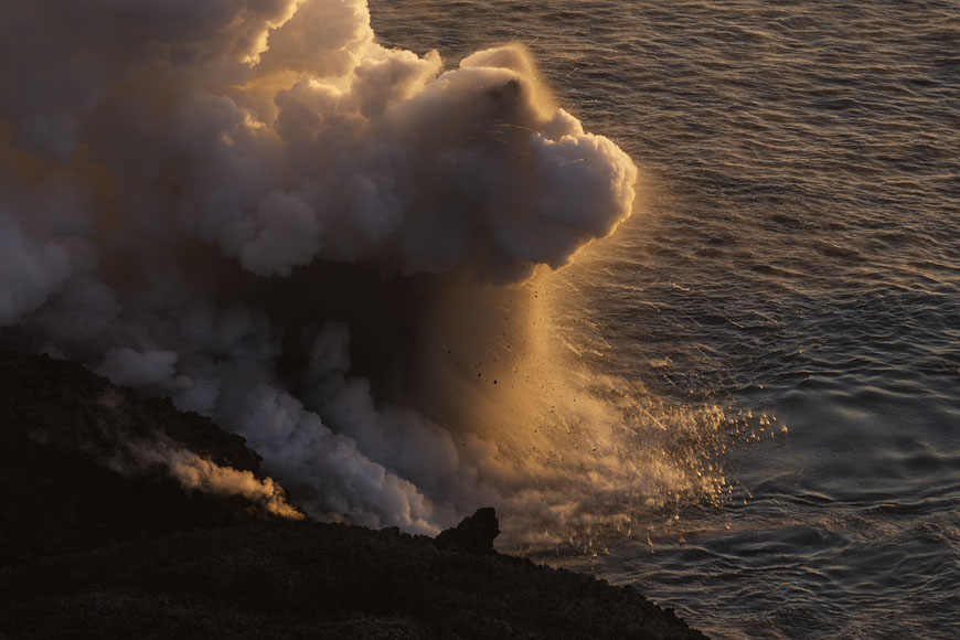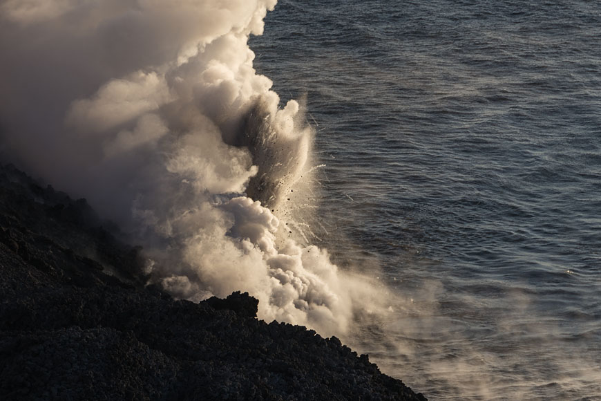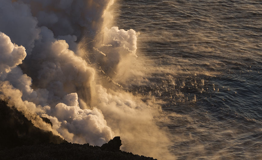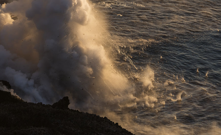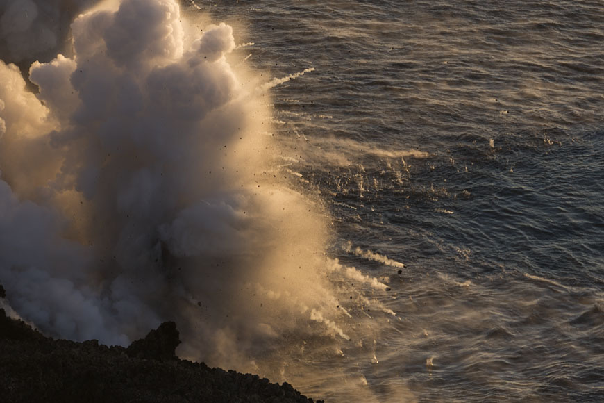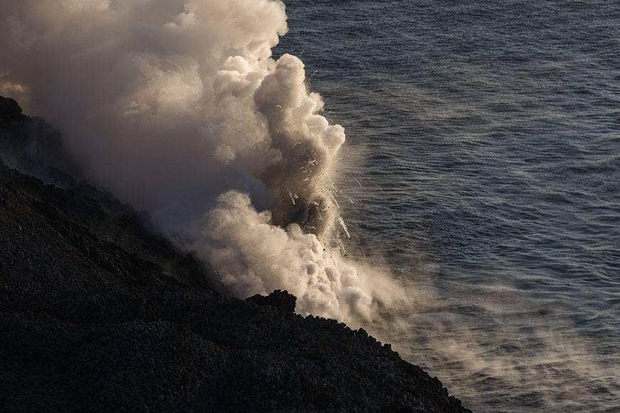 Littoral explosions casting numerous lava fragments which are raining down into the Sea |