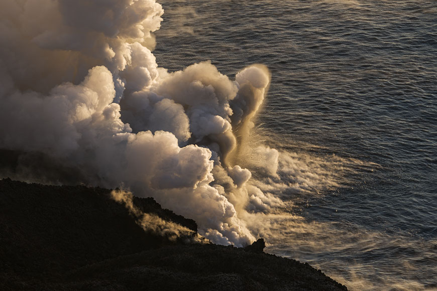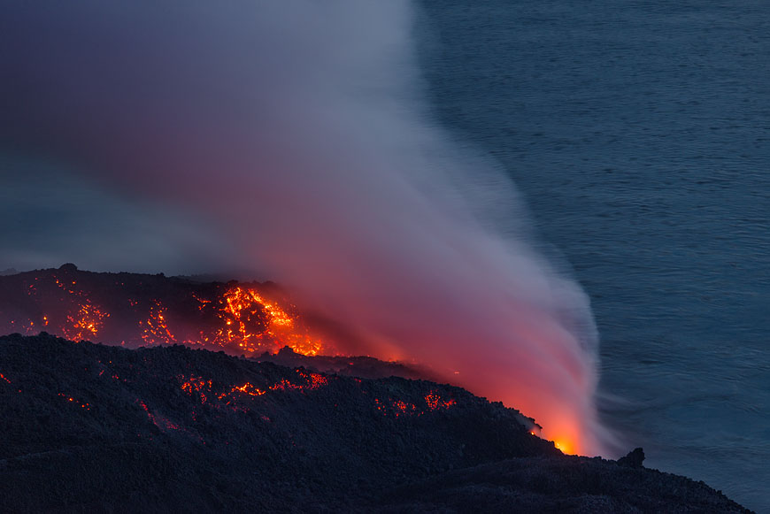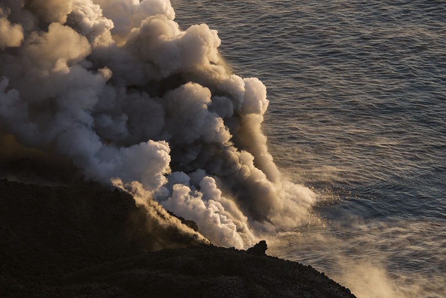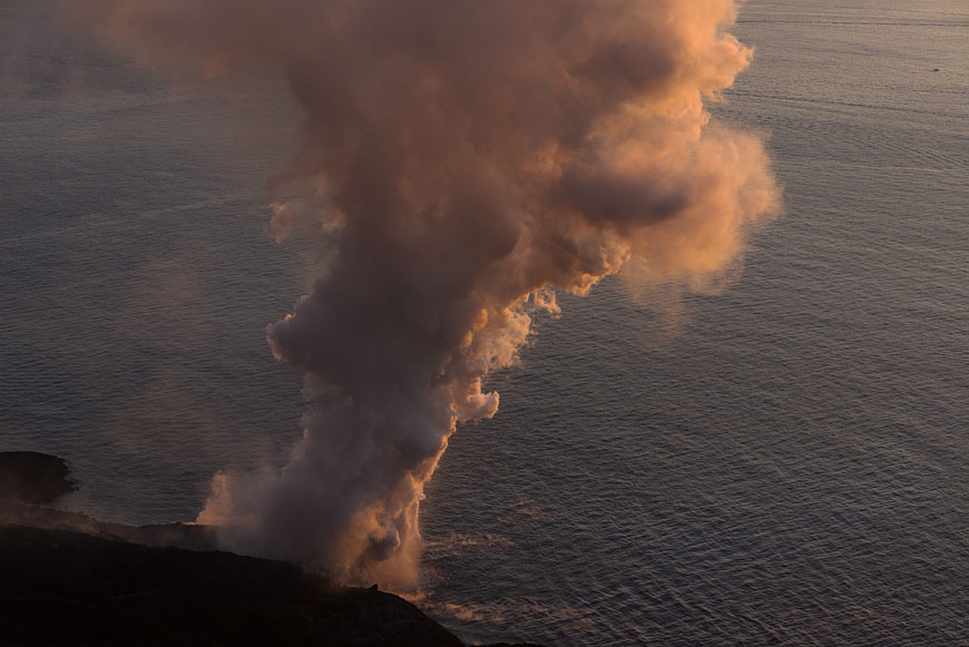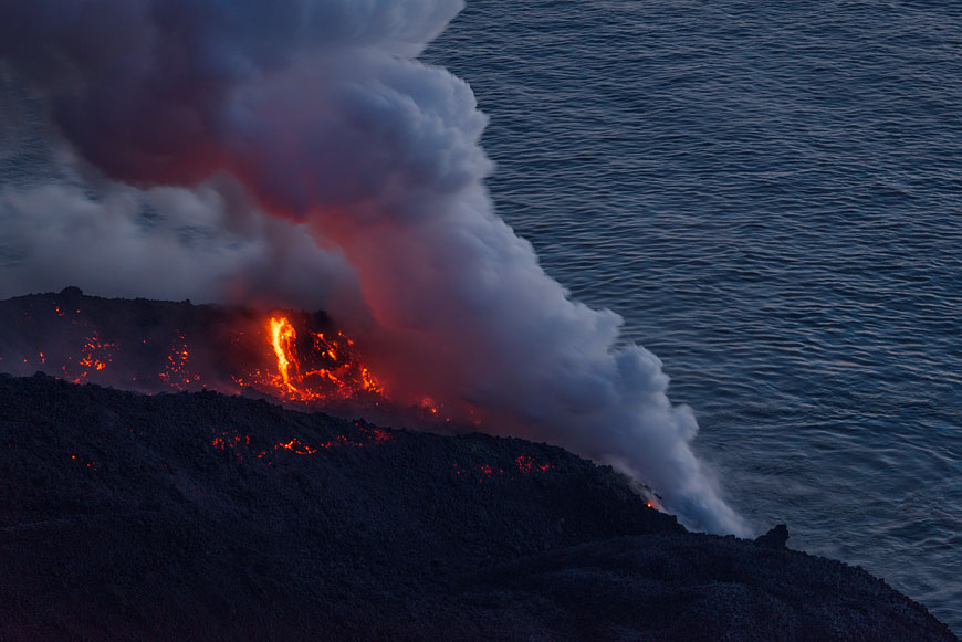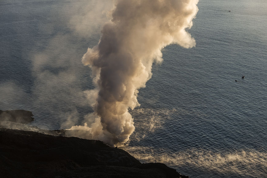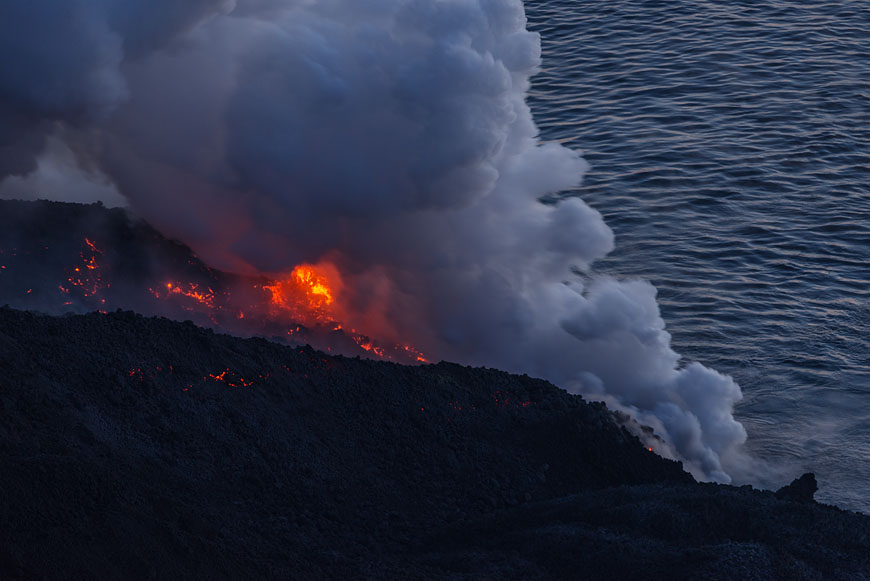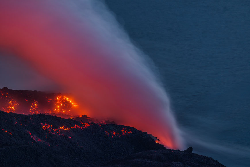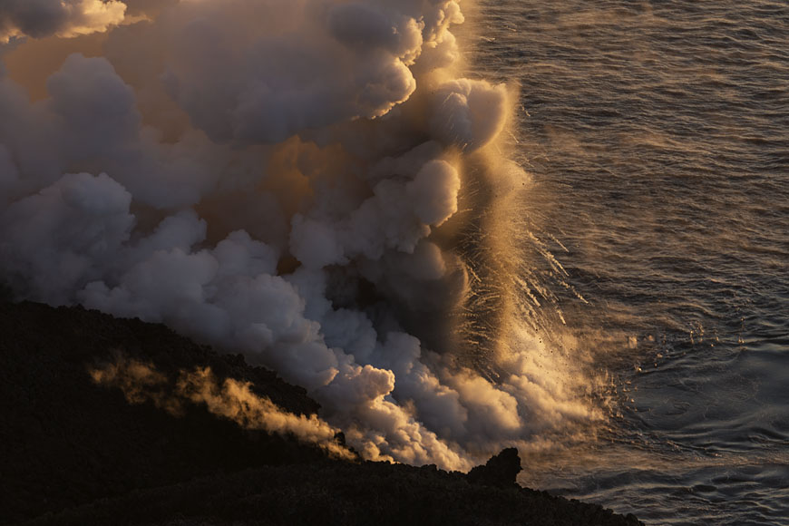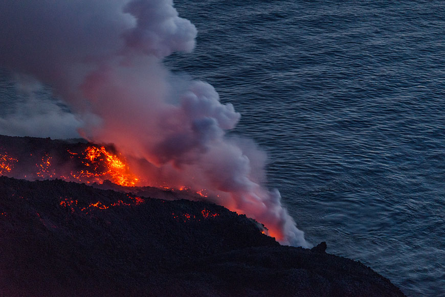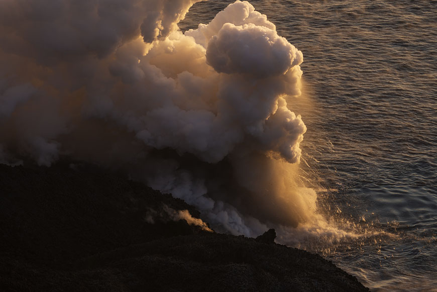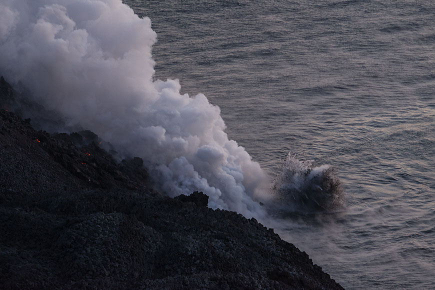 Littoral explosions casting numerous lava fragments which are raining down into the Sea |