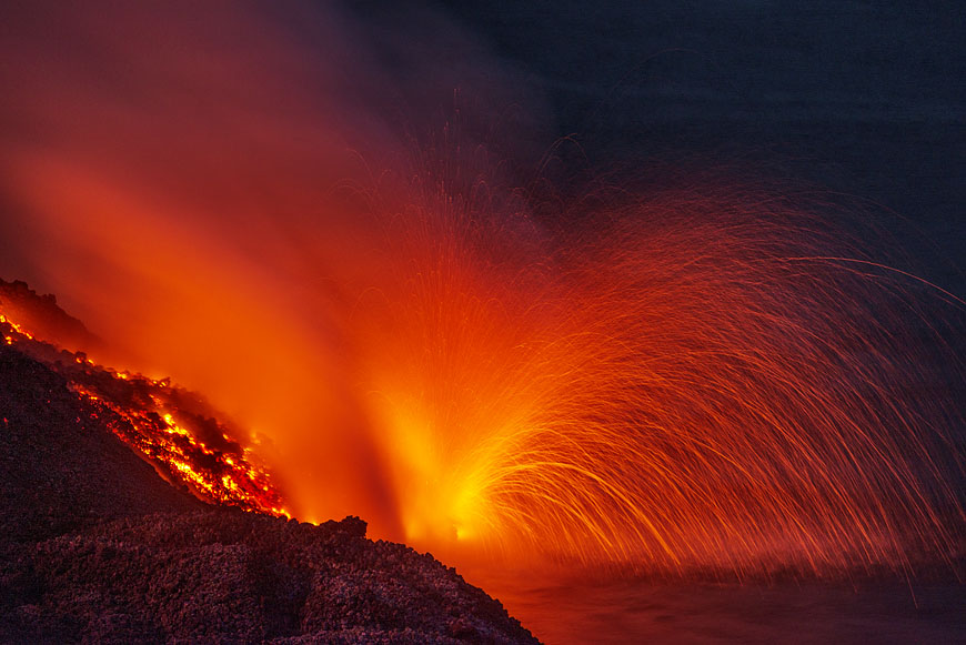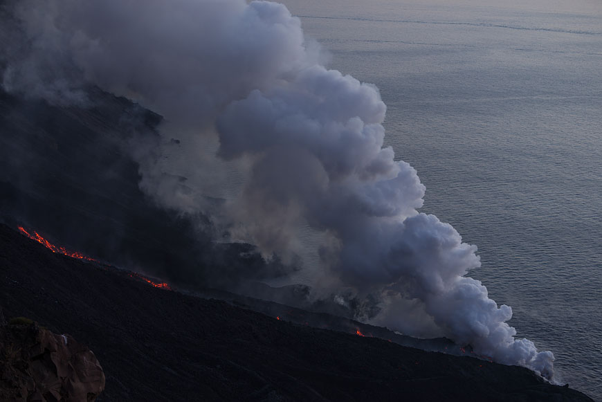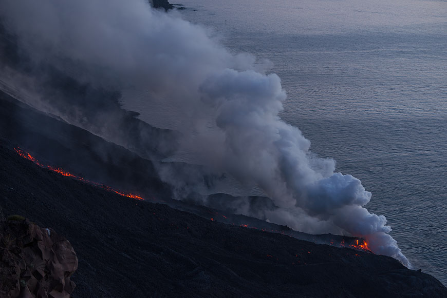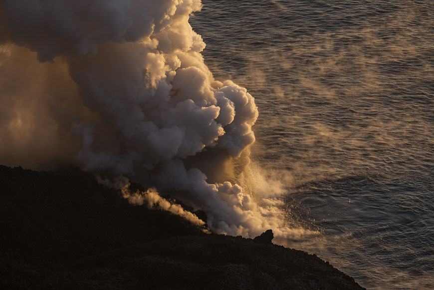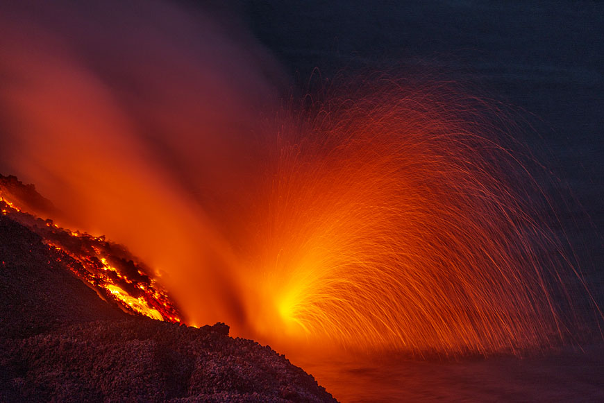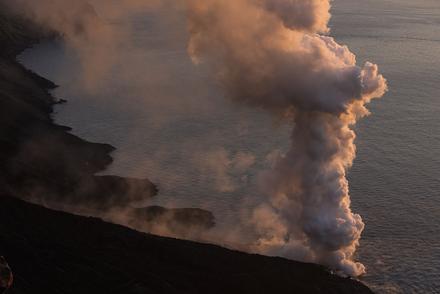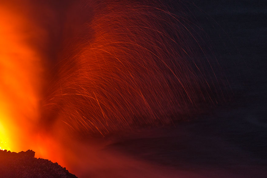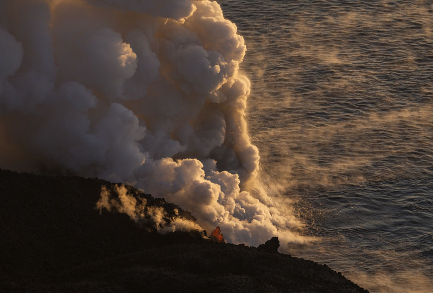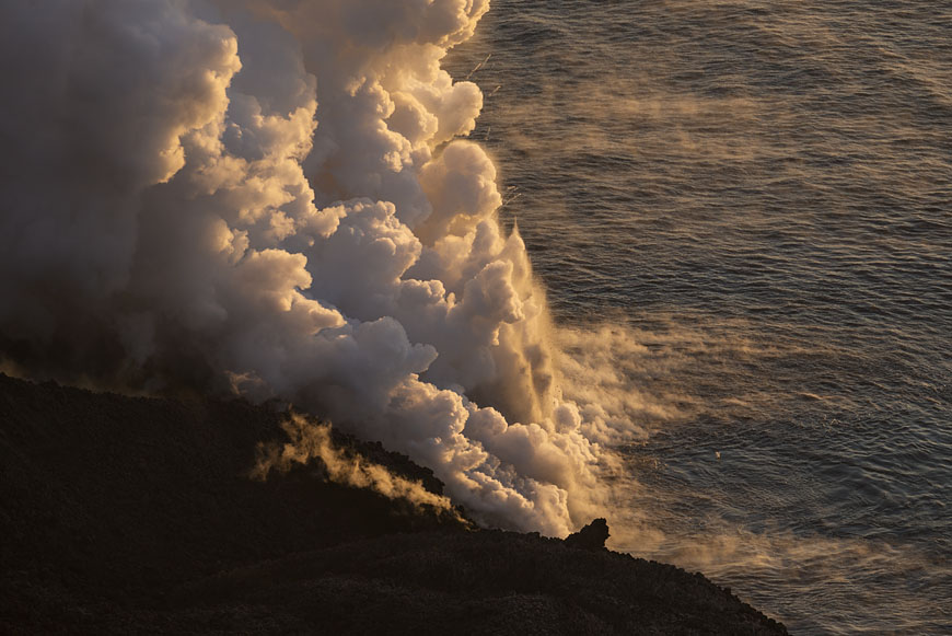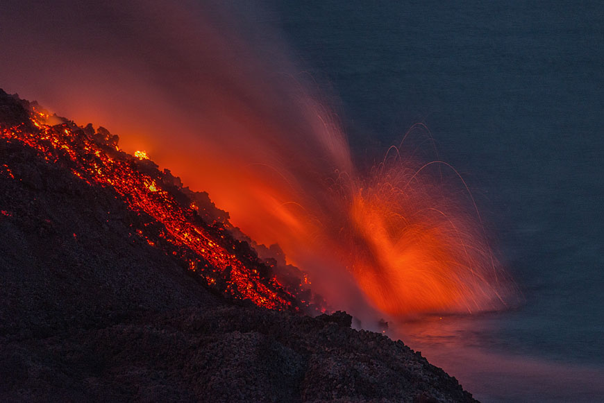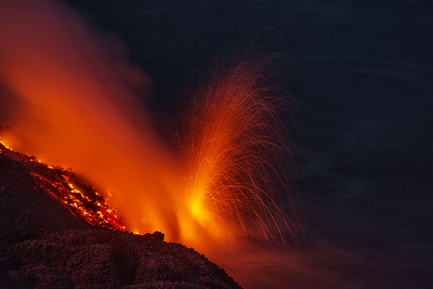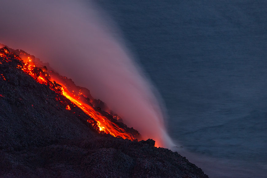 Littoral explosions casting numerous lava fragments which are raining down into the Sea |