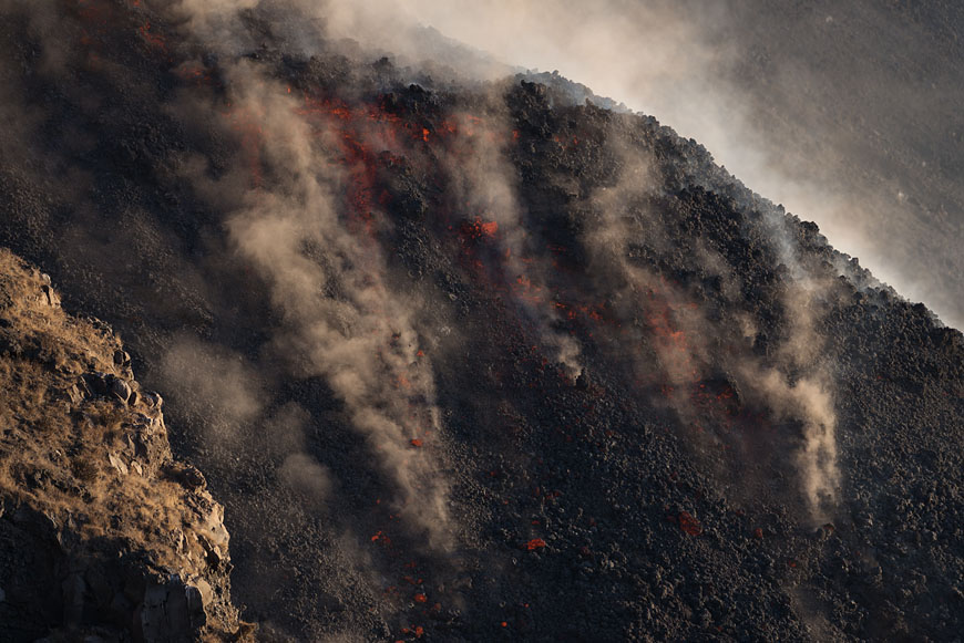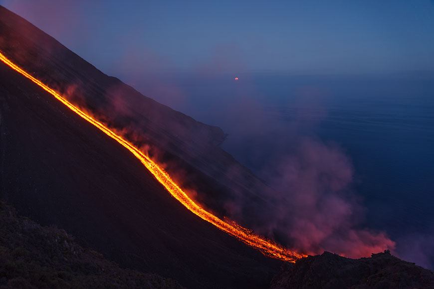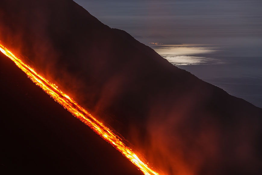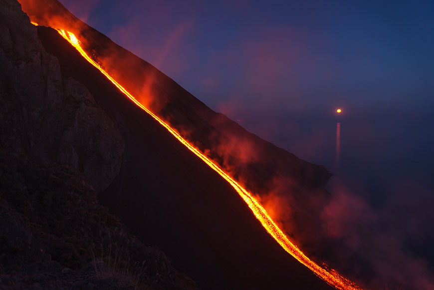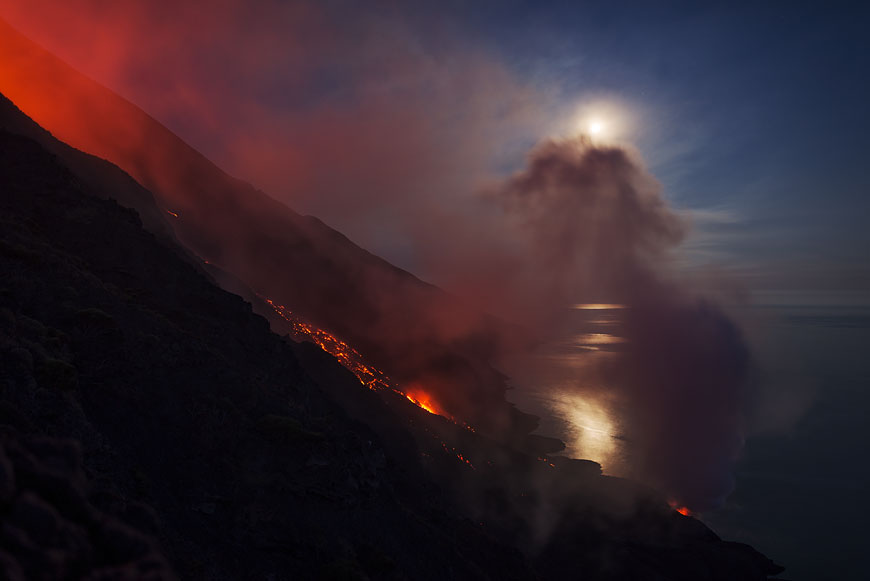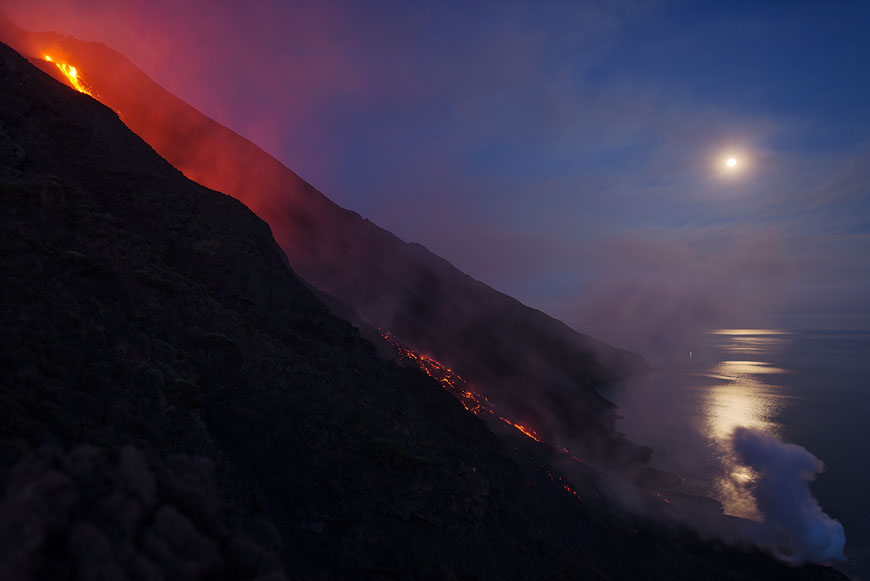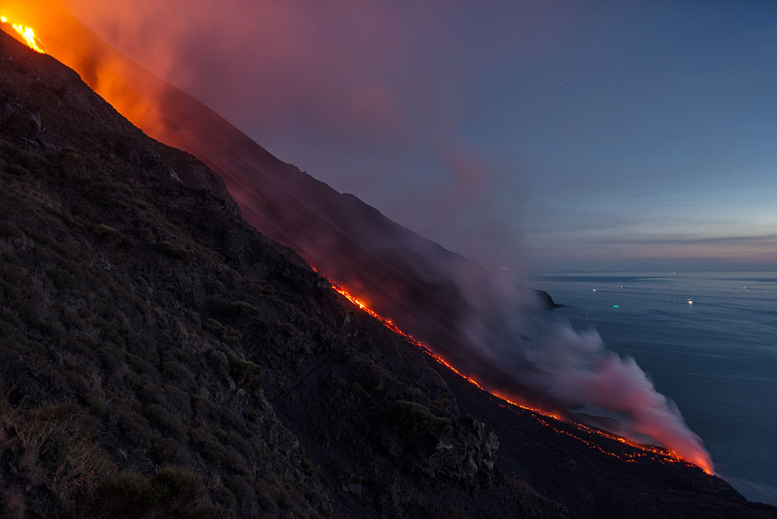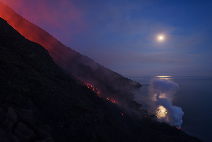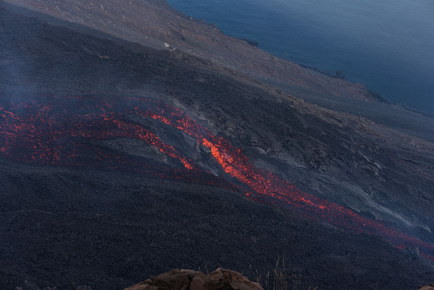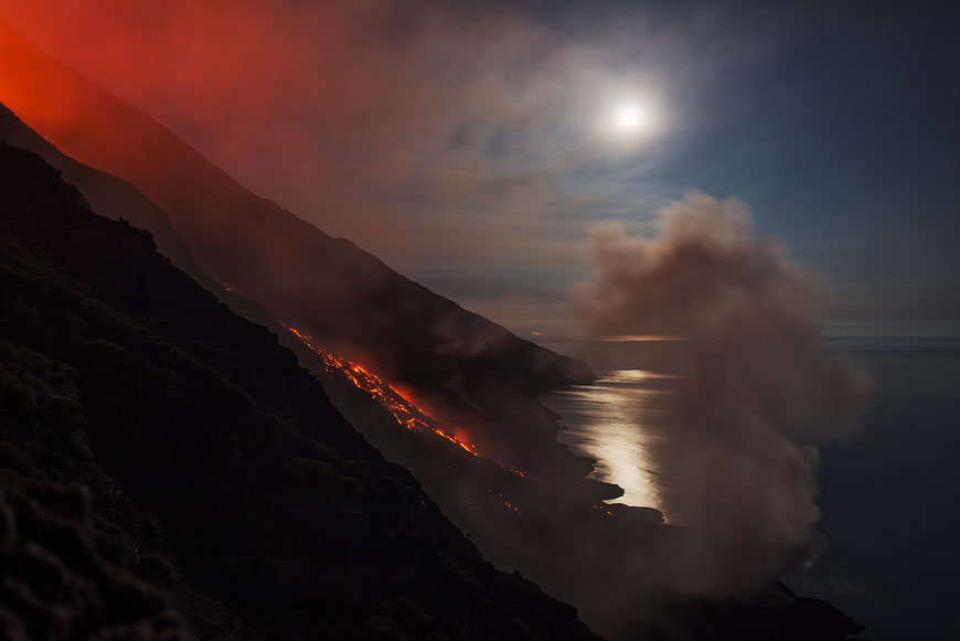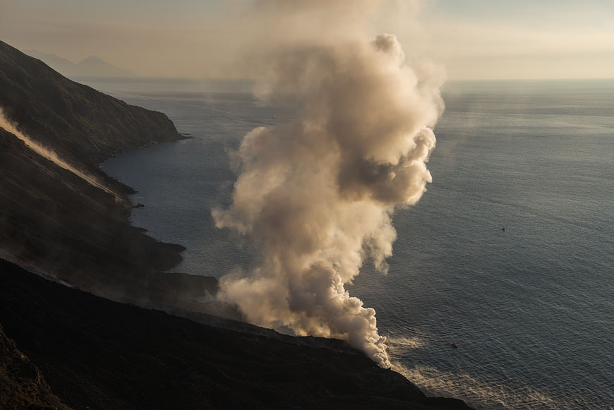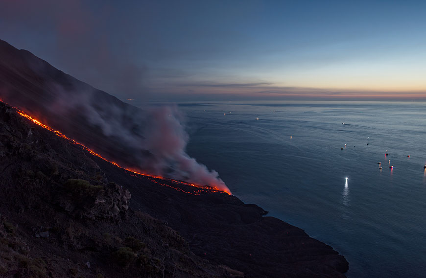 Littoral explosions casting numerous lava fragments which are raining down into the Sea |