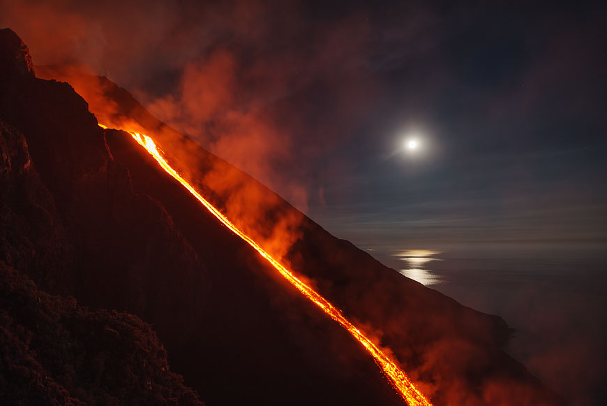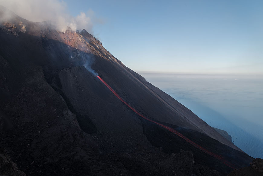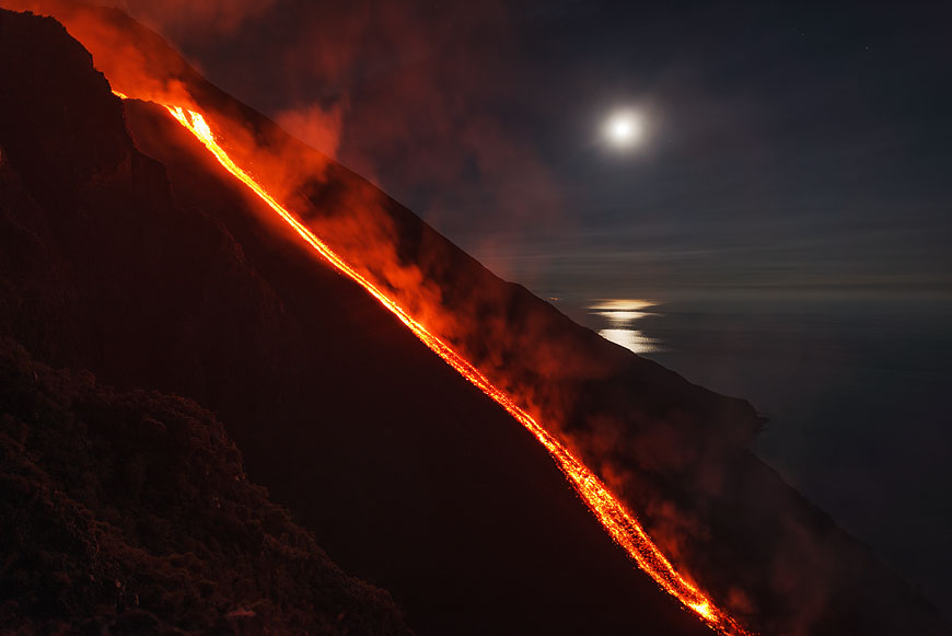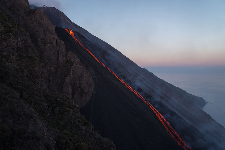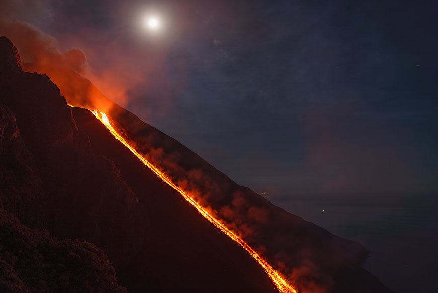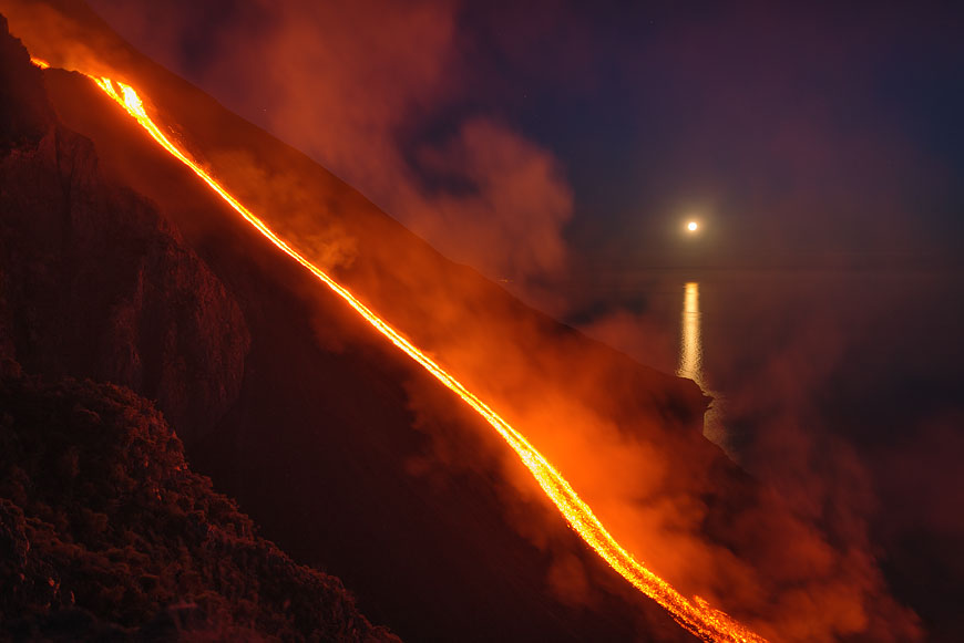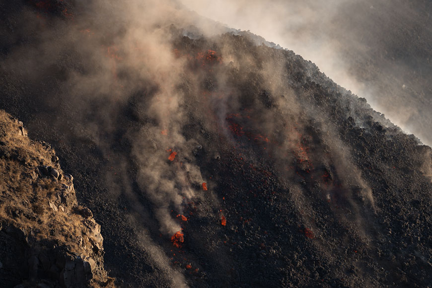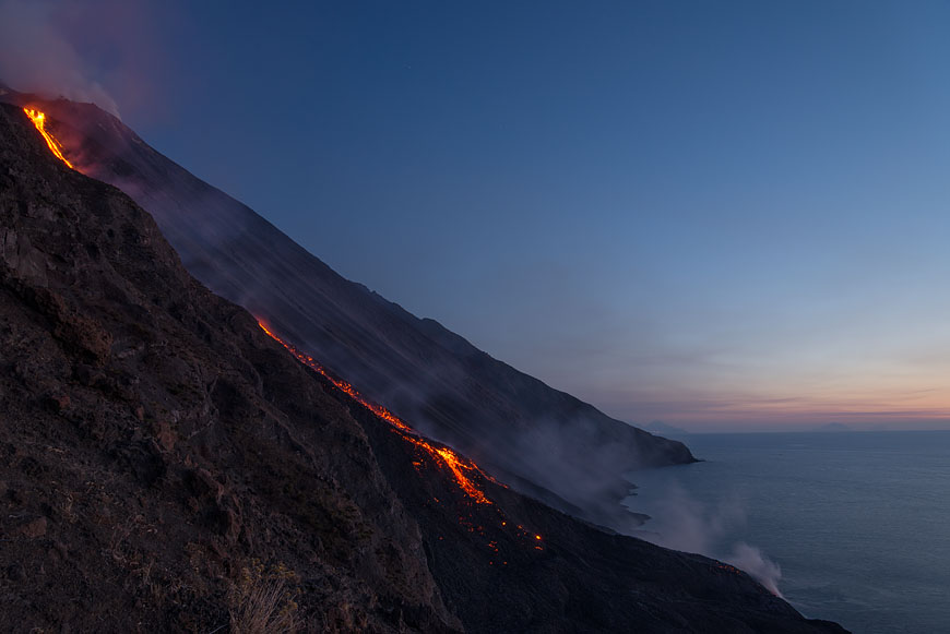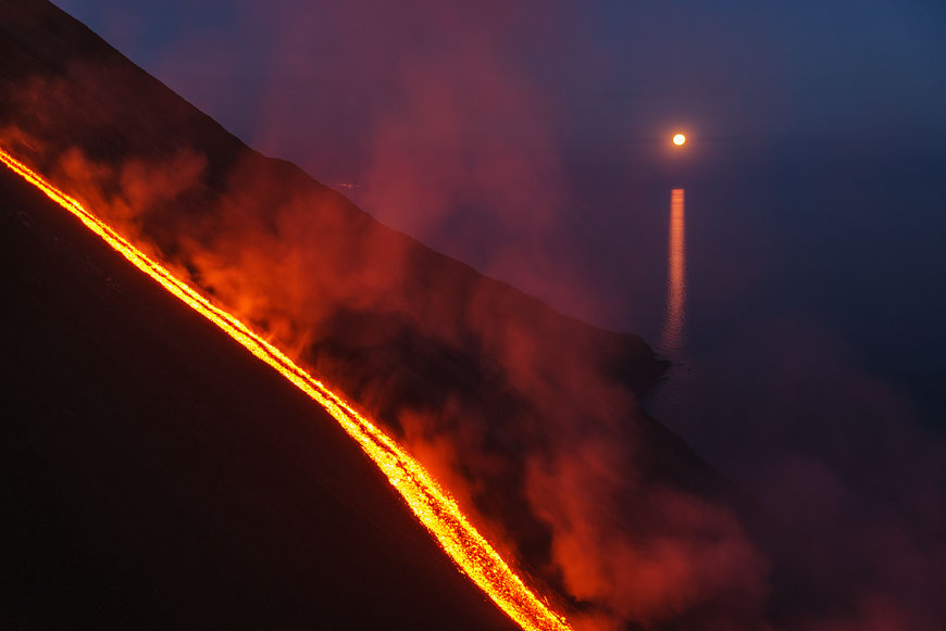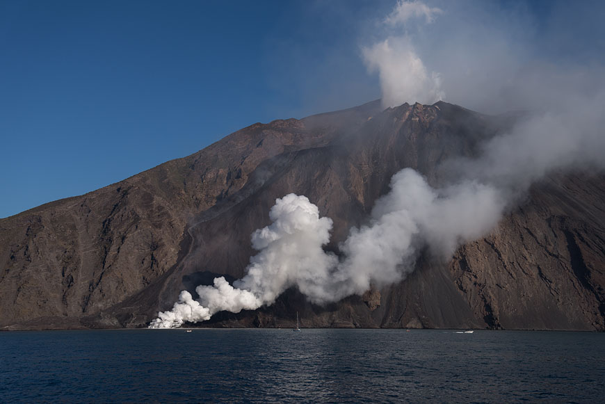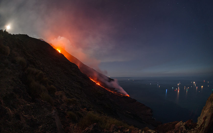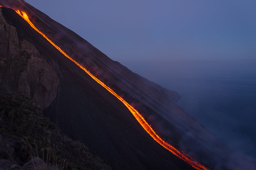Littoral explosions casting numerous lava fragments which are raining down into the Sea |