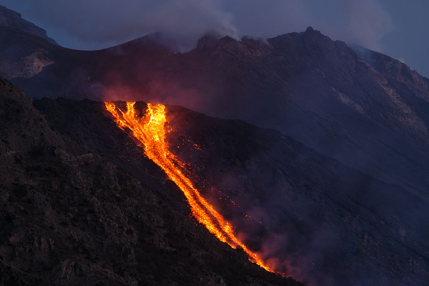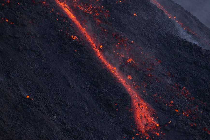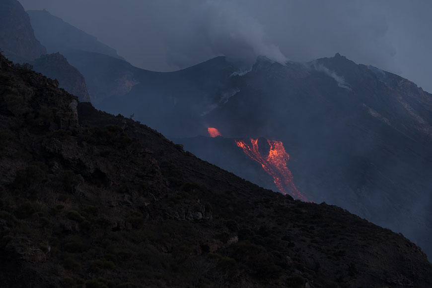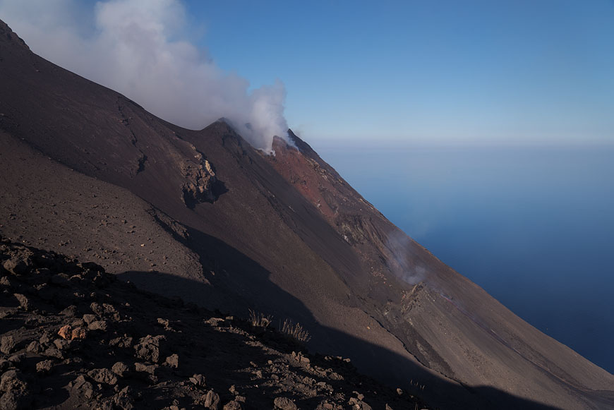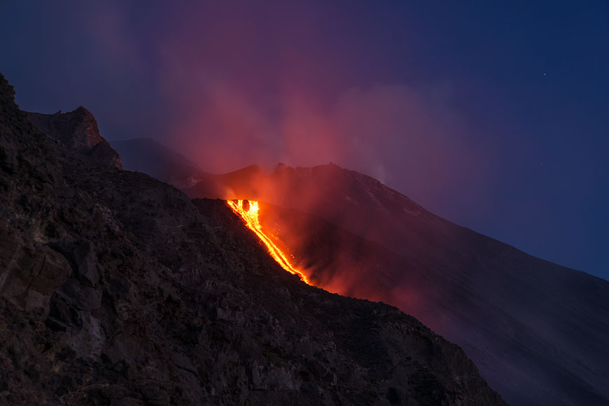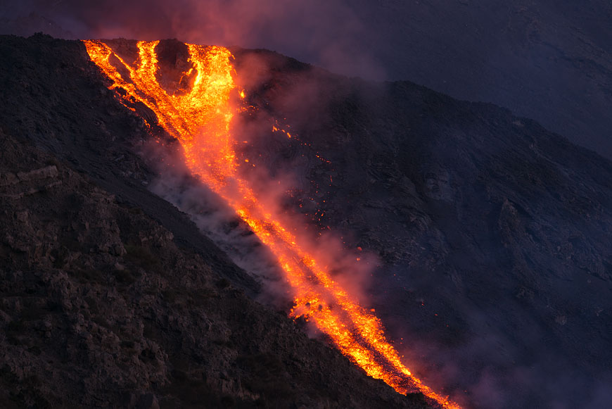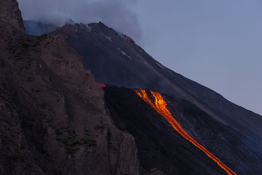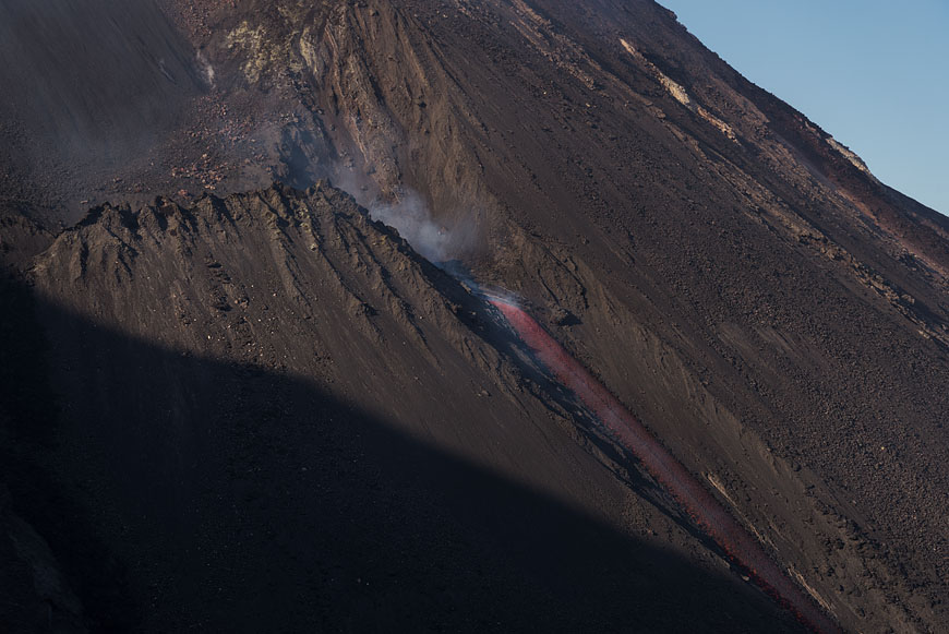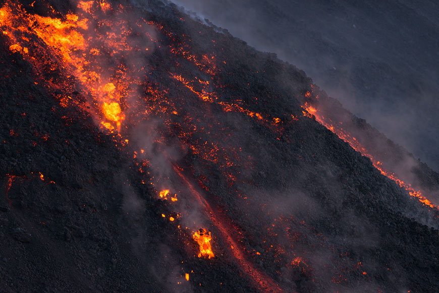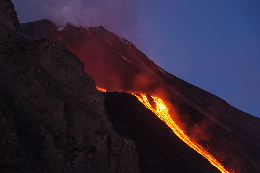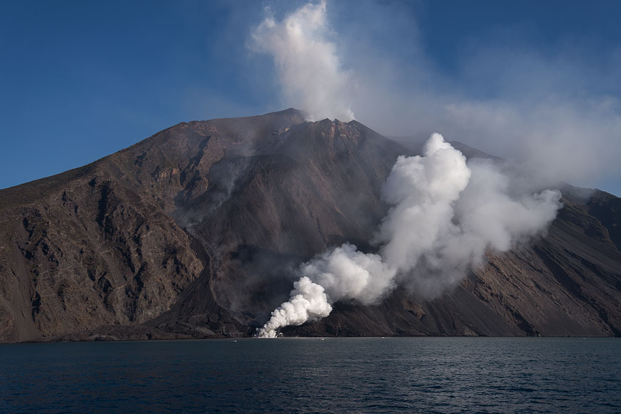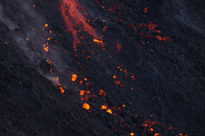 Littoral explosions casting numerous lava fragments which are raining down into the Sea |