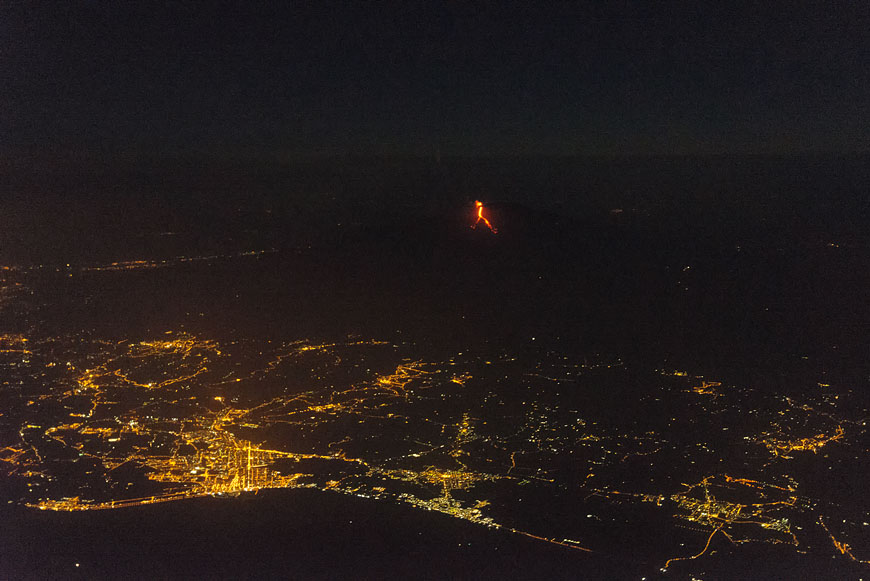 Etna summit eruption with Sicily coastline seen from airplane while flying home |