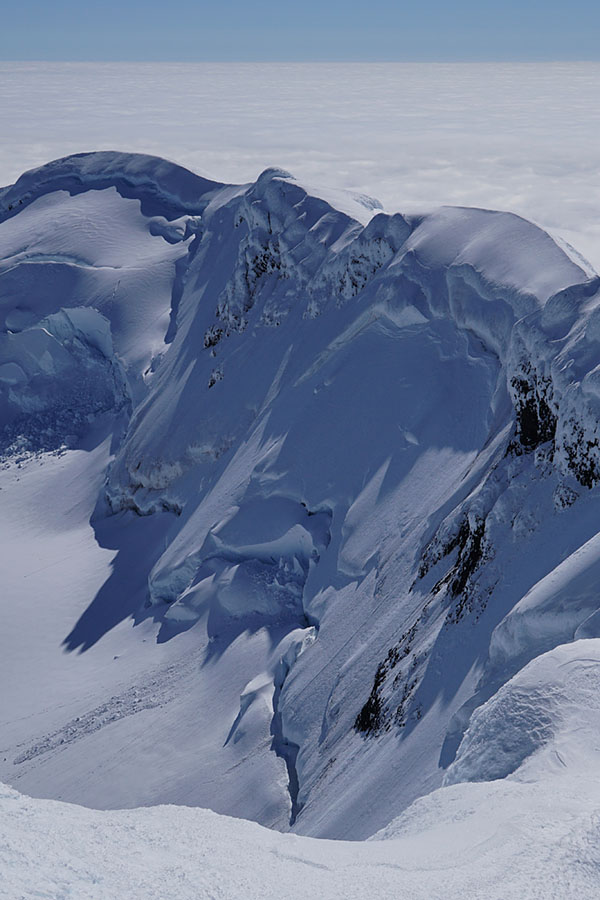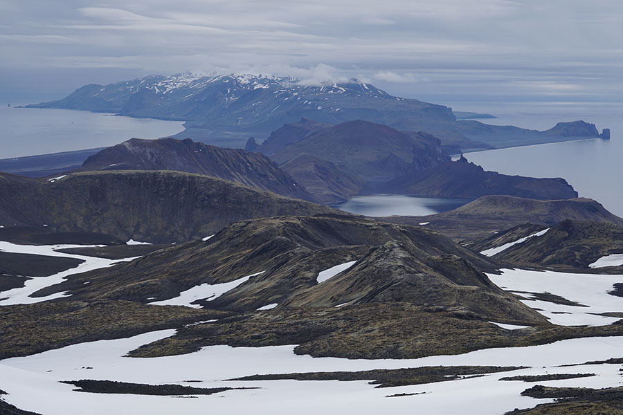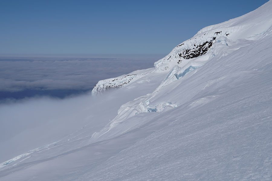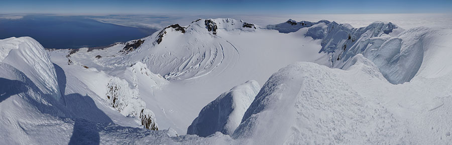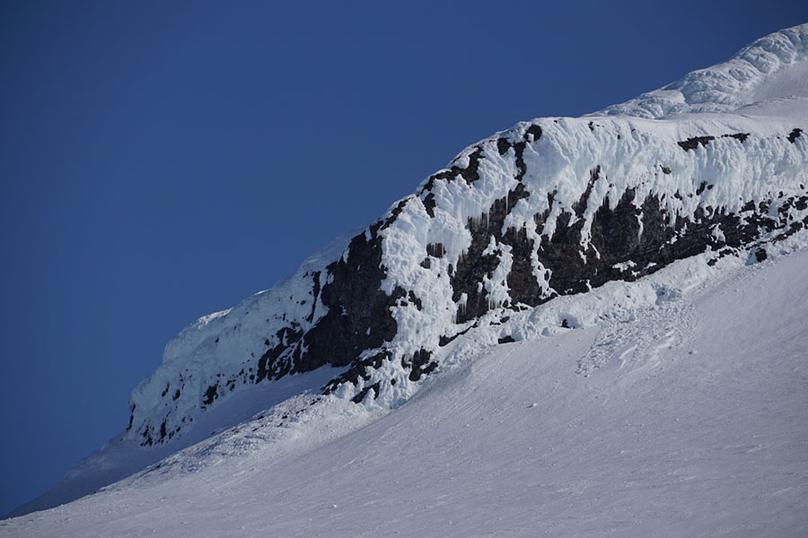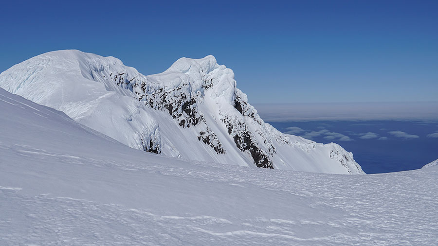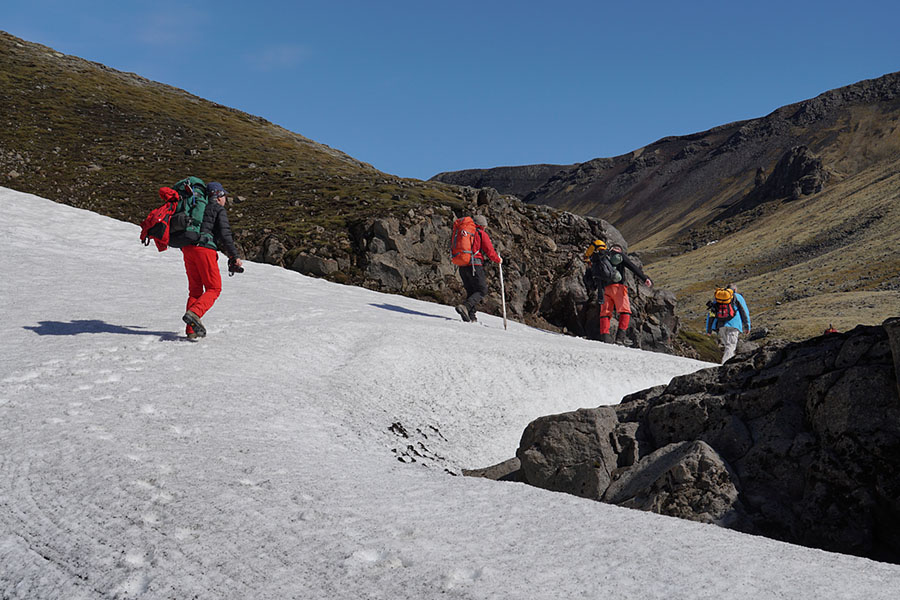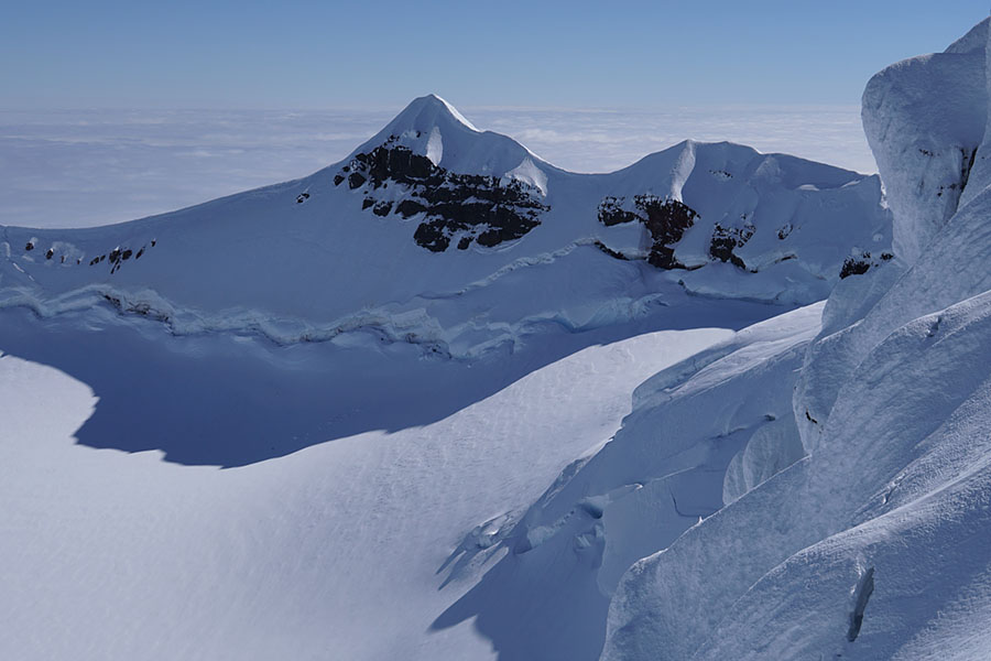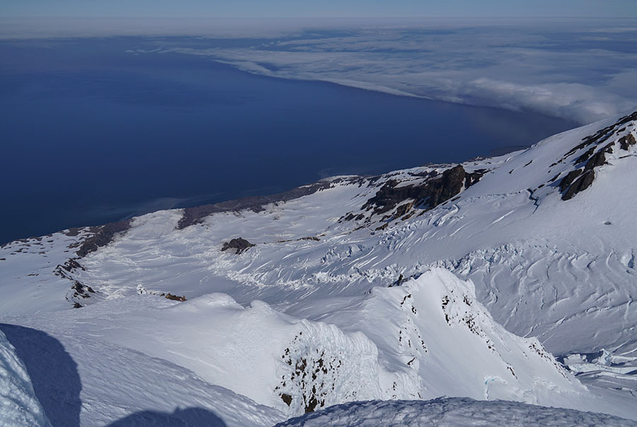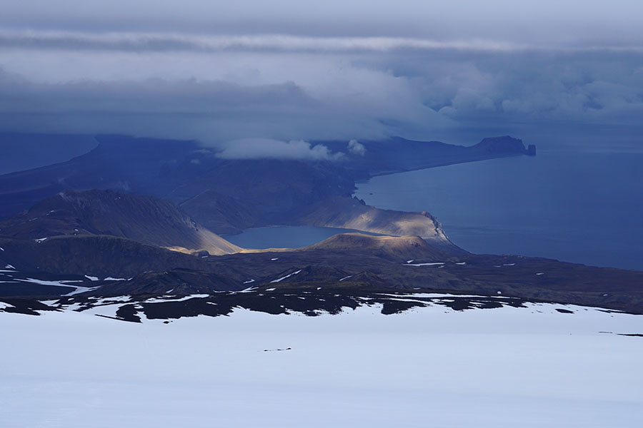 leaving Bergdalen behind our group alongside Sorlaguna heading for Beerenberg bypassing Soyla with our goal behind bypassing Nordlaguna view back to Nordlaguna climbing Beerenbergs S-flank climbing Beerenbergs S-flank Beerenberg still in far distance searching for a bivouac site near the snowline view back to the starting point this morning behind Kvalrossen (far to the right) fresh water is needed preparing bivouac for a few hours resting view down to Jan Mayen the next morning, inmidst of the seemingly endless Kronprins Olavs Breen glacier heading for the summit, now above cloudlevel Haakon VII (main summit in the background) above us  only 3 of us on the way to the summit crevassed terrain above cloud level finding our way through heavily crevassed terrain rime and icicle laden cliffs above the clouds crevassed S flank climbing steeper terrain crater ridge above us first view into summit crater summit crater panorama first view to main summit me on the very summit of Beerenberg, the highest point of the N atlantic view from Haakon VII (main summit) down to the Weyprechtbreen and W coast view back to the recently climbed crater ridge full crater panorama, Weyprechtbreen to the left upper part of Weyprechtbreen crater rim W part of crater W part of crater looking down the Weyprechtbreen climbing down the same way view back Haakon VII (main summit) behind crevasse slalom on the way back crevasse slalom on the way back diving into cloud level again seemingly endless glacier crossing in weak midday snow further down into the clouds bypassing Pukkelryggen on the way back, arriving at campsite  around 11pm after approx. 20h of nearly nonstop walking