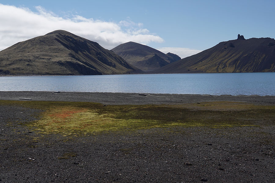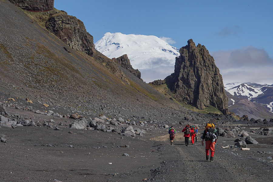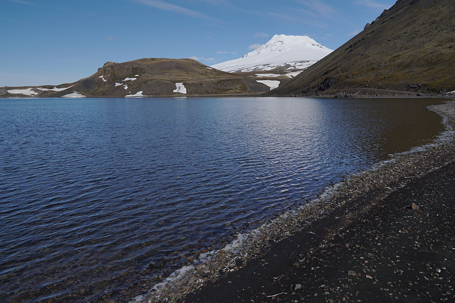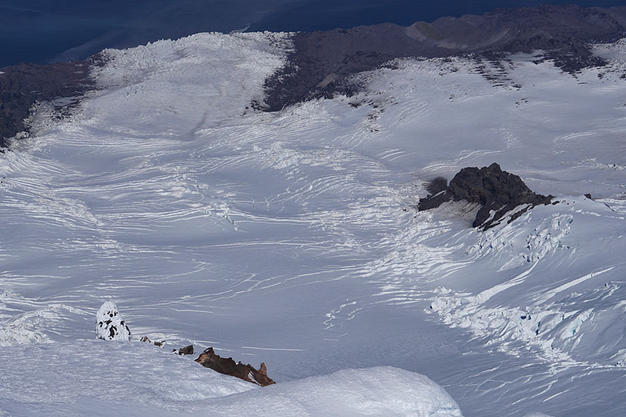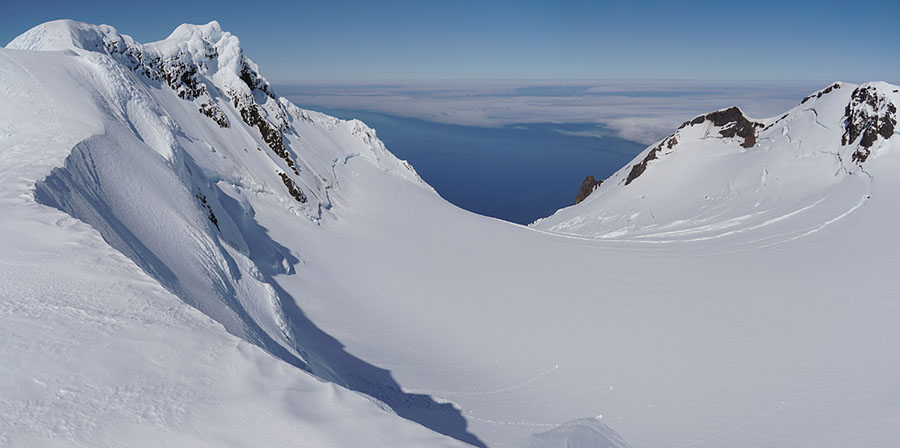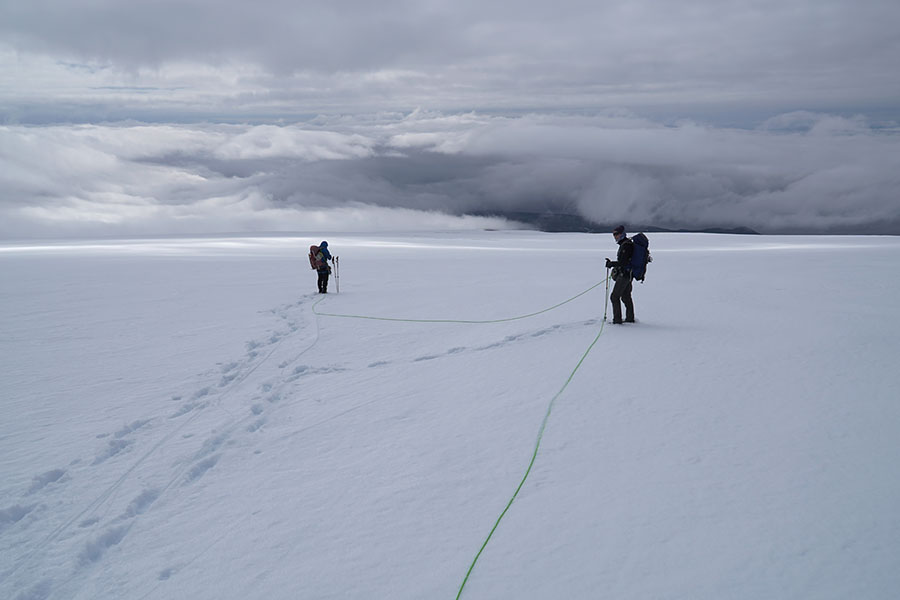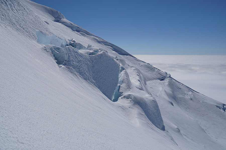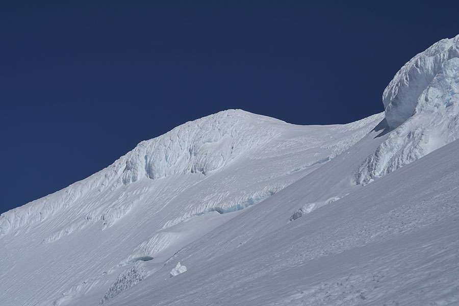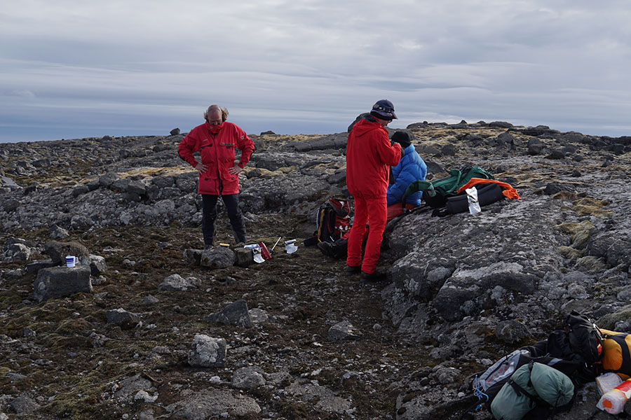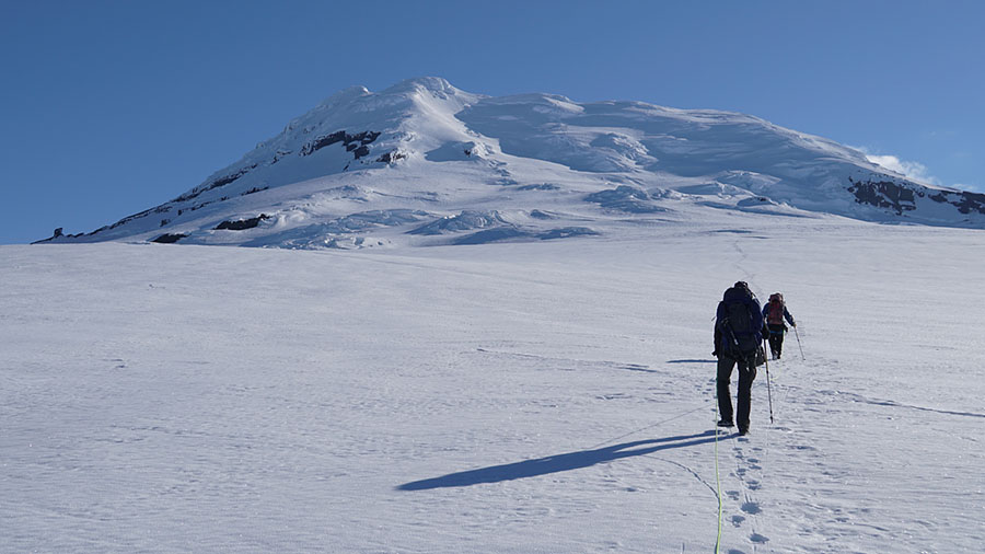 leaving Bergdalen behind our group alongside Sorlaguna heading for Beerenberg bypassing Soyla with our goal behind bypassing Nordlaguna view back to Nordlaguna climbing Beerenbergs S-flank climbing Beerenbergs S-flank Beerenberg still in far distance searching for a bivouac site near the snowline view back to the starting point this morning behind Kvalrossen (far to the right) fresh water is needed preparing bivouac for a few hours resting view down to Jan Mayen the next morning, inmidst of the seemingly endless Kronprins Olavs Breen glacier heading for the summit, now above cloudlevel Haakon VII (main summit in the background) above us  only 3 of us on the way to the summit crevassed terrain above cloud level finding our way through heavily crevassed terrain rime and icicle laden cliffs above the clouds crevassed S flank climbing steeper terrain crater ridge above us first view into summit crater summit crater panorama first view to main summit me on the very summit of Beerenberg, the highest point of the N atlantic view from Haakon VII (main summit) down to the Weyprechtbreen and W coast view back to the recently climbed crater ridge full crater panorama, Weyprechtbreen to the left upper part of Weyprechtbreen crater rim W part of crater W part of crater looking down the Weyprechtbreen climbing down the same way view back Haakon VII (main summit) behind crevasse slalom on the way back crevasse slalom on the way back diving into cloud level again seemingly endless glacier crossing in weak midday snow further down into the clouds bypassing Pukkelryggen on the way back, arriving at campsite  around 11pm after approx. 20h of nearly nonstop walking