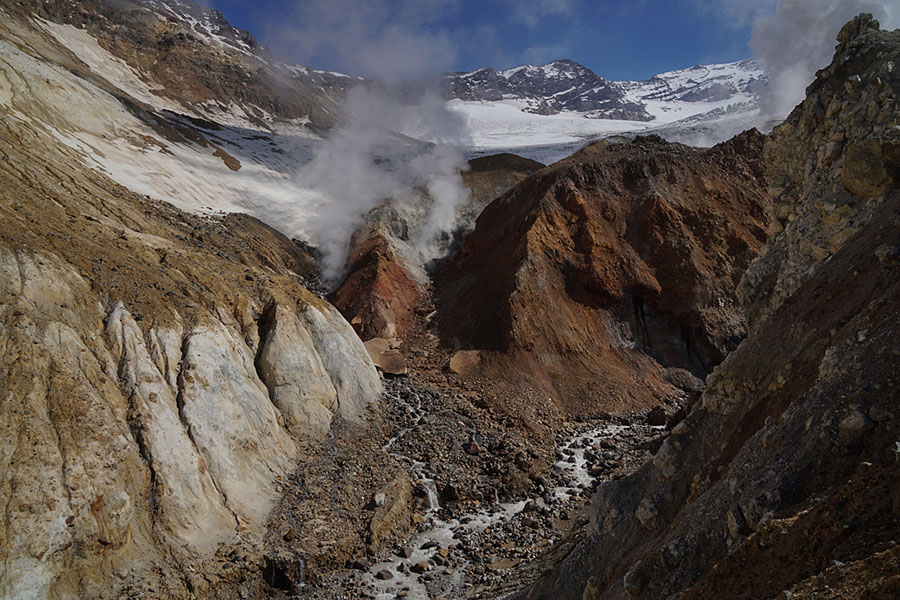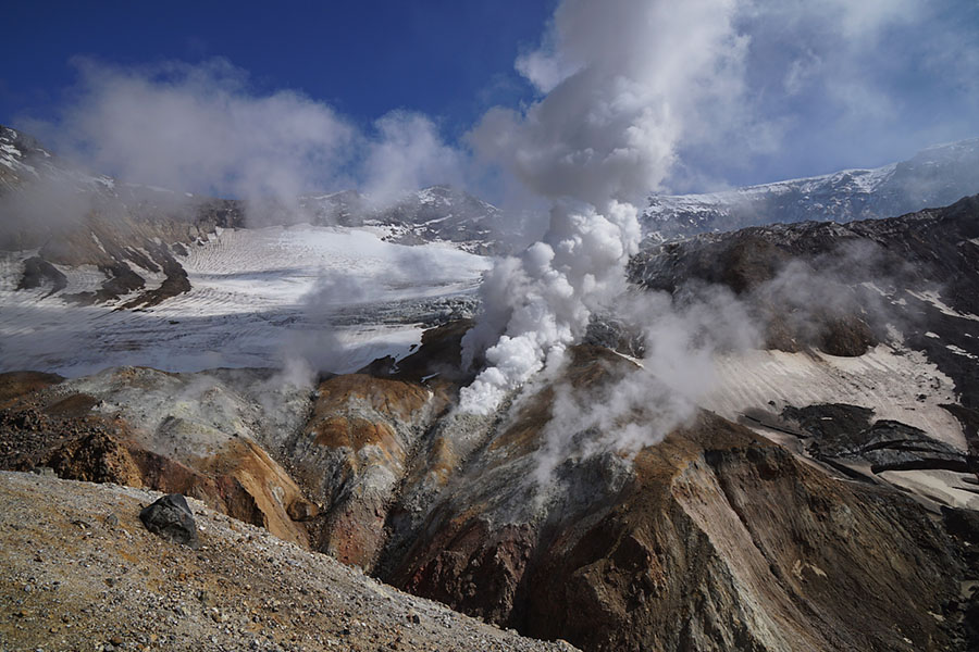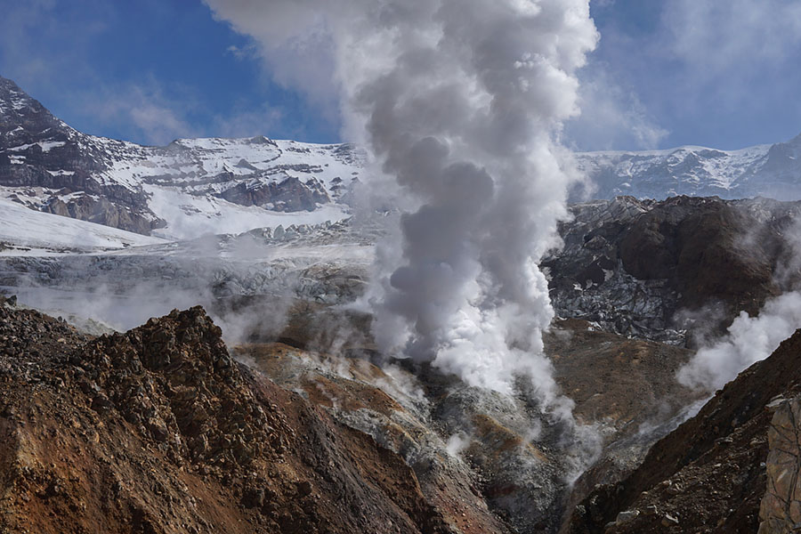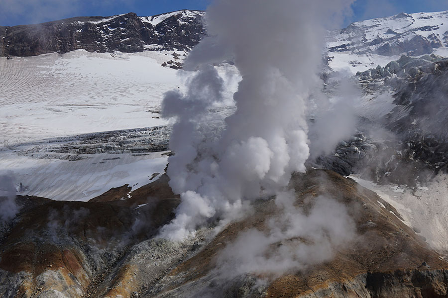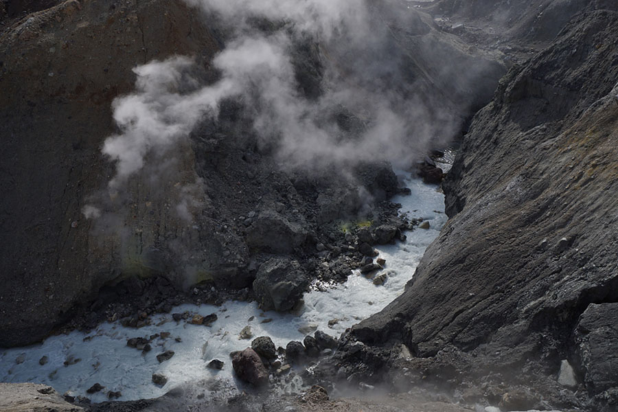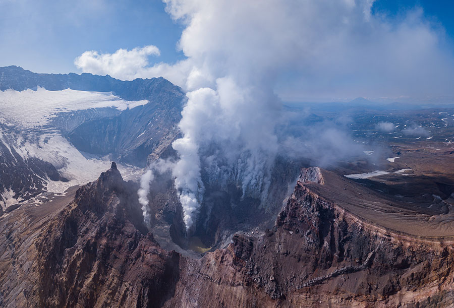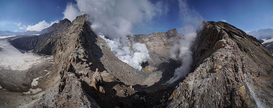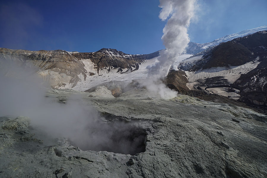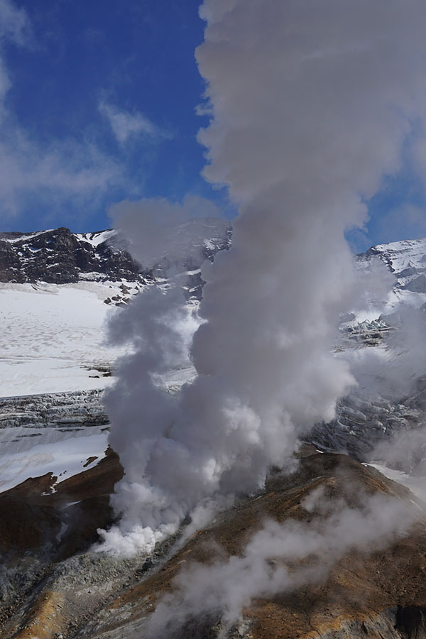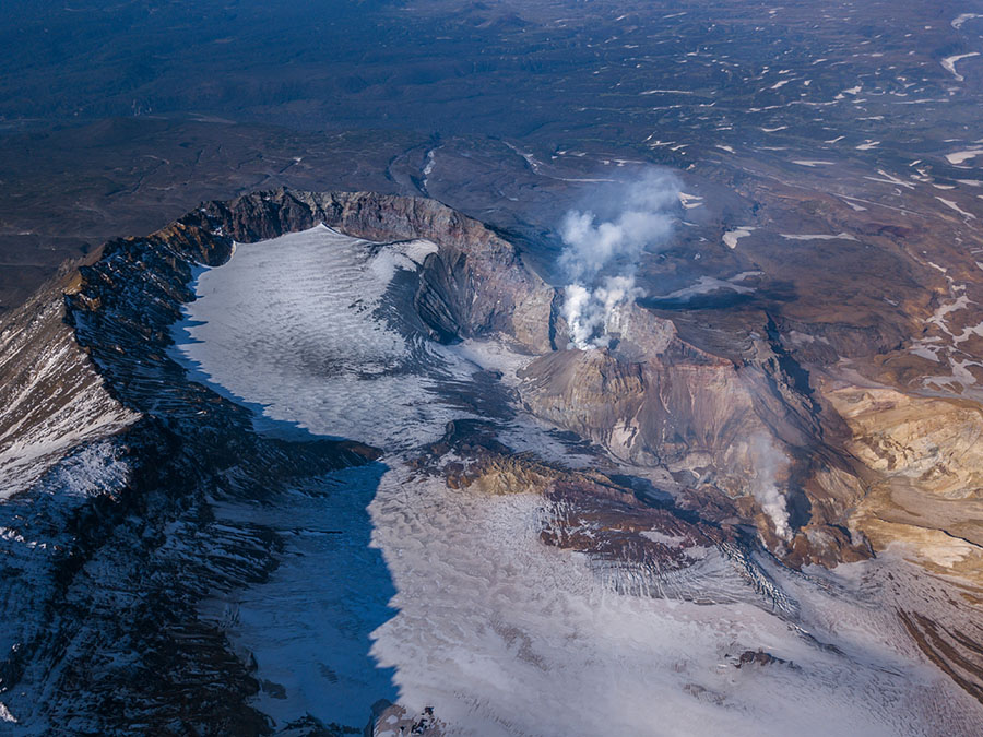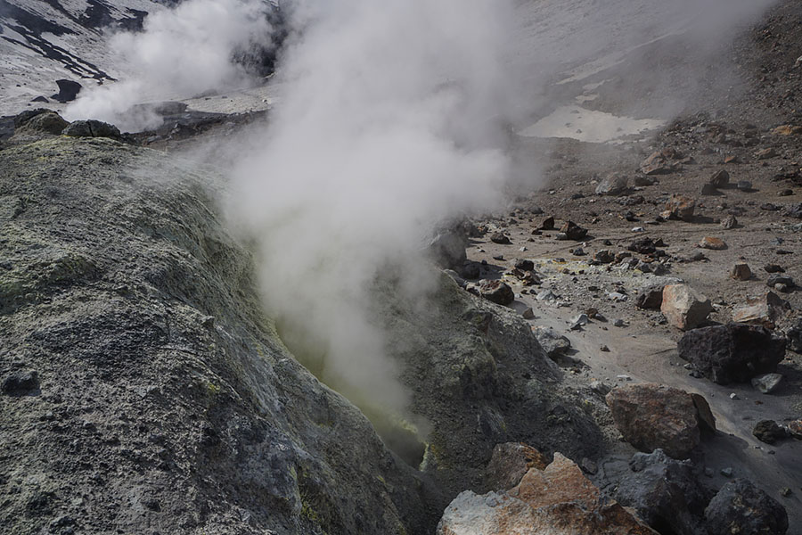 Mutnovsky (2322m) from W, airborne image Mutnovsky from S, airborne image Mutnovsky from above, airborne image active crater, airborne image active crater, airborne image pano entering Mutnovsky from the W side lower end of innercrater glacier melthole inside glacier broken glacier ice fumarole inside crater fumarole inside crater view to S inside crater fumarole inside crater mudpool in front fumarole with sulfur deposits innercrater river crater landscape snow covered crater lake SE crater panorama main fumarole field main fumarole mirroring in pond boiling mudpool boiling mudpool boiling mudpool sulfur deposits fumarole with sulfur deposits fumarole with sulfur deposits meltwater cascade main fumarole field inside crater main fumarole field inside crater main fumarole field inside crater main fumarole field inside crater leaving crater canyon on Mutnovskys W side canyon on Mutnovskys W side canyon on Mutnovskys W side meltwater cascade melting snow deposits