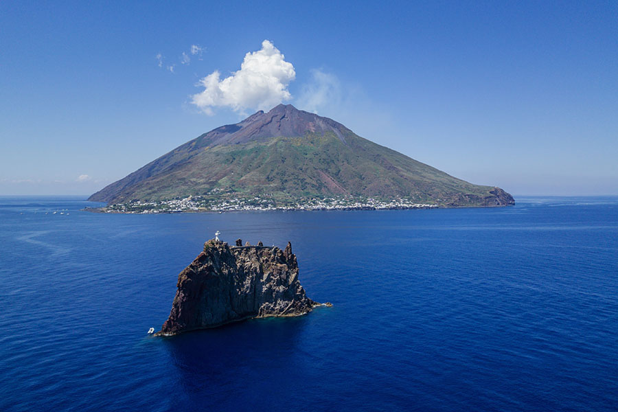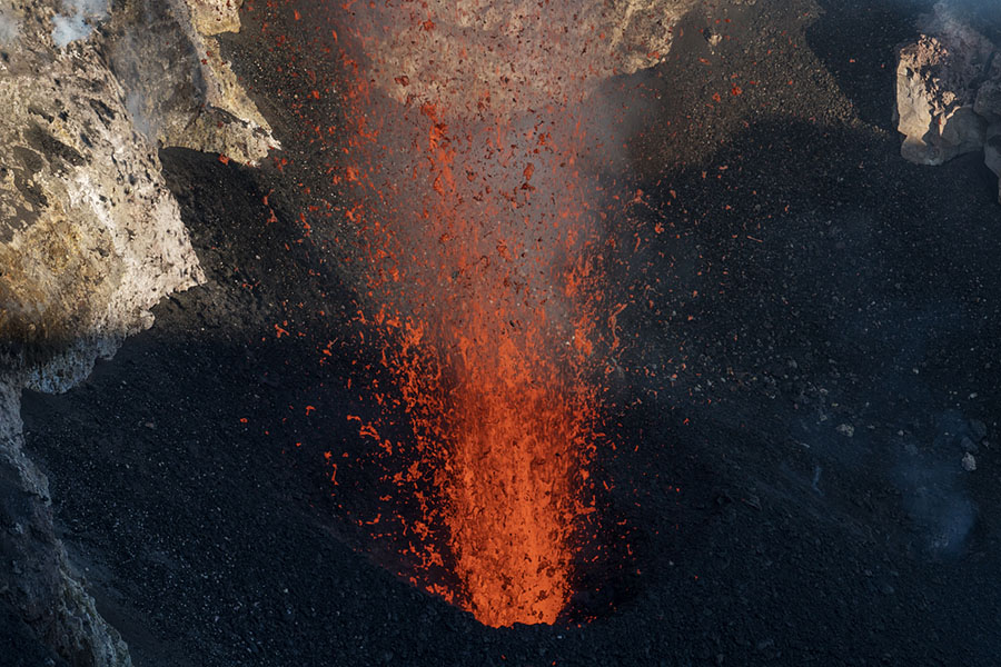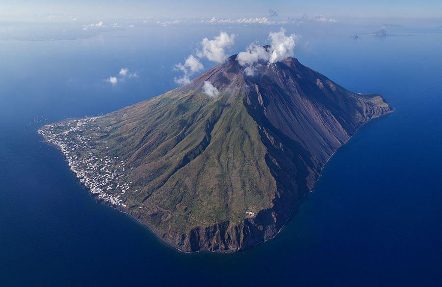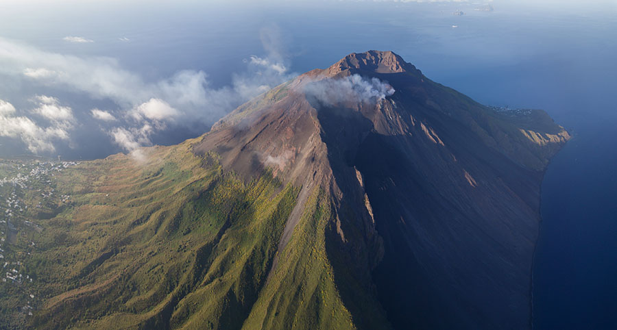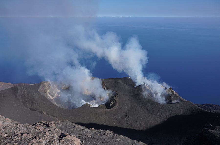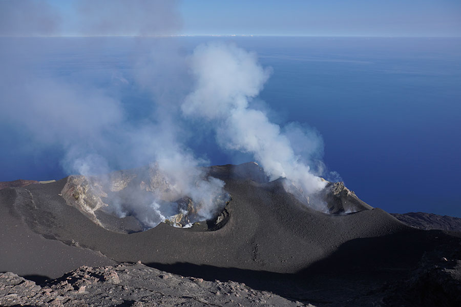 Stromboli island - airborne view Strombolicchio in front of main island Stromboli - summit area Crater terrace seen from summit Crater terrace seen from summit simultaneous eruptions from E and W vents E vent eruption Strombolian eruption from W vent in daylight fisher boats at the coast volcano behind coastline simultaneous eruptions from E and W vents simultaneous eruptions from E and W vents Strombolian eruption from W vent in dawn volcano seen from harbour Strombolicchio behind