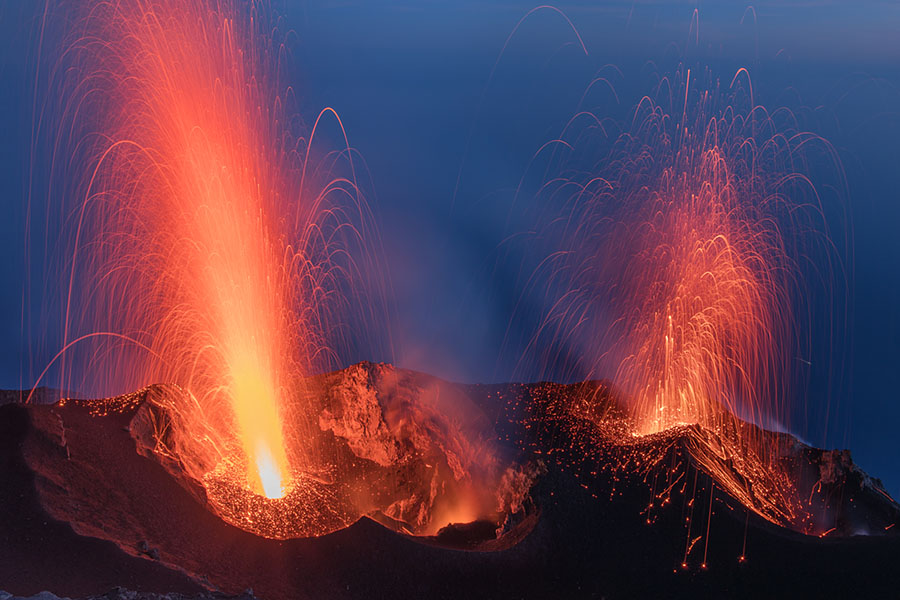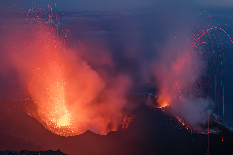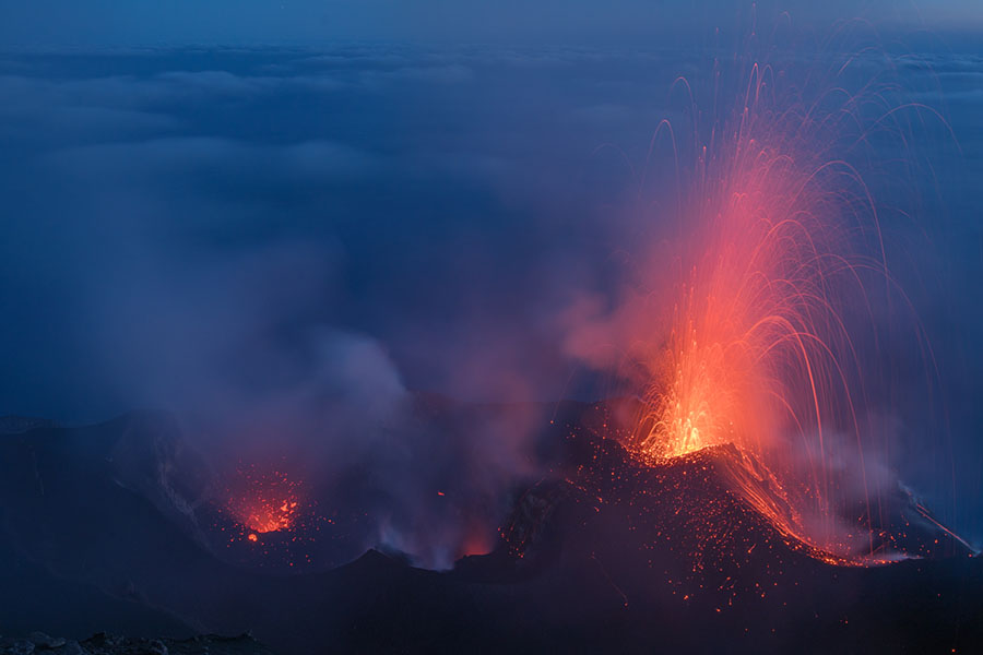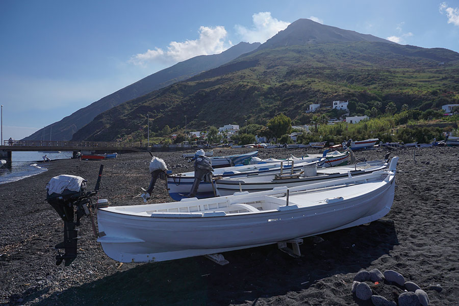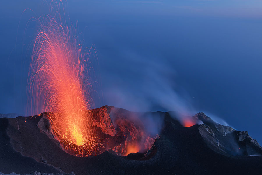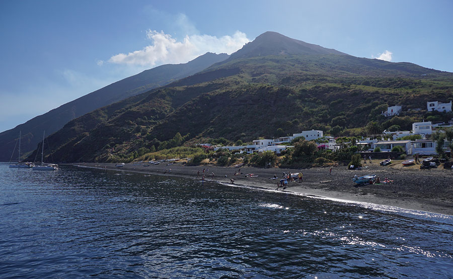 Stromboli island - airborne view Strombolicchio in front of main island Stromboli - summit area Crater terrace seen from summit Crater terrace seen from summit simultaneous eruptions from E and W vents E vent eruption Strombolian eruption from W vent in daylight fisher boats at the coast volcano behind coastline simultaneous eruptions from E and W vents simultaneous eruptions from E and W vents Strombolian eruption from W vent in dawn volcano seen from harbour Strombolicchio behind
